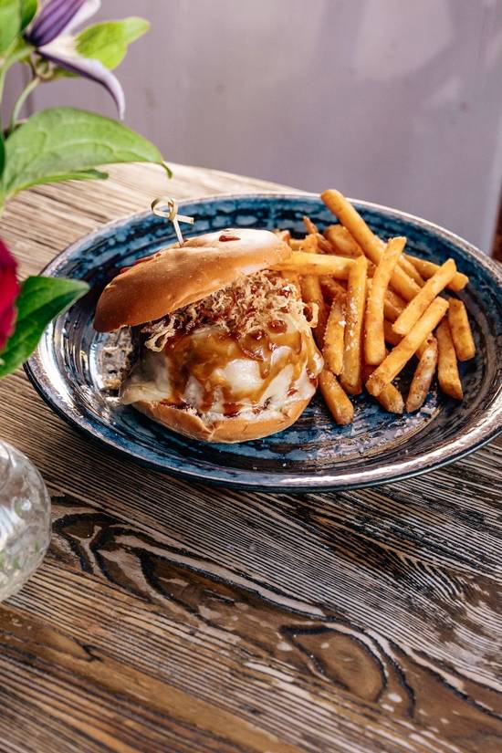Cheddar cheese, lettuce, tomato, red onion, homemade sauce