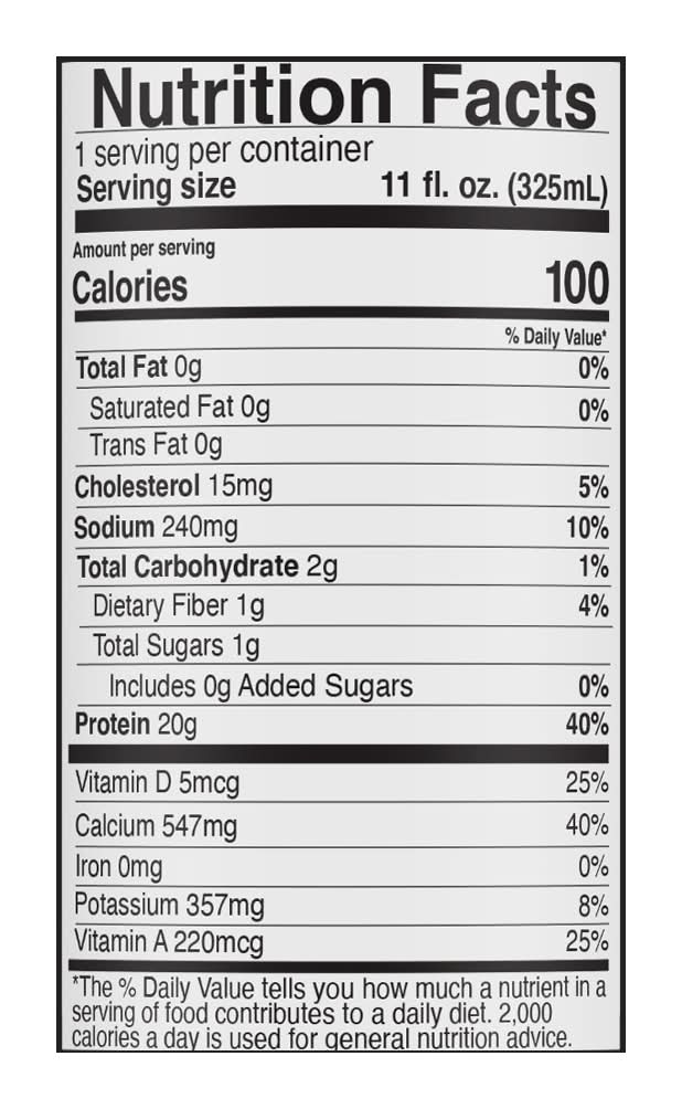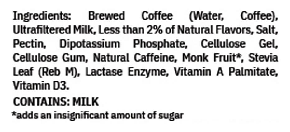 Ingredients: Brewed Coffee (Water Coffee), Ultrafiltered Skim Milk, Less than 2% of Natural Flavors, Salt, Pectin, Dipotassium Phosphate, Cellulose Get, Cellulose Gum, Natural Caffeine, Monk Fruit (Adds an Insignificant Amount of Sugar), Stevia Leaf (Reb M), Lactase Enzyme, Vitamin A Palmitate, Vitamin D3 Contains: Milk