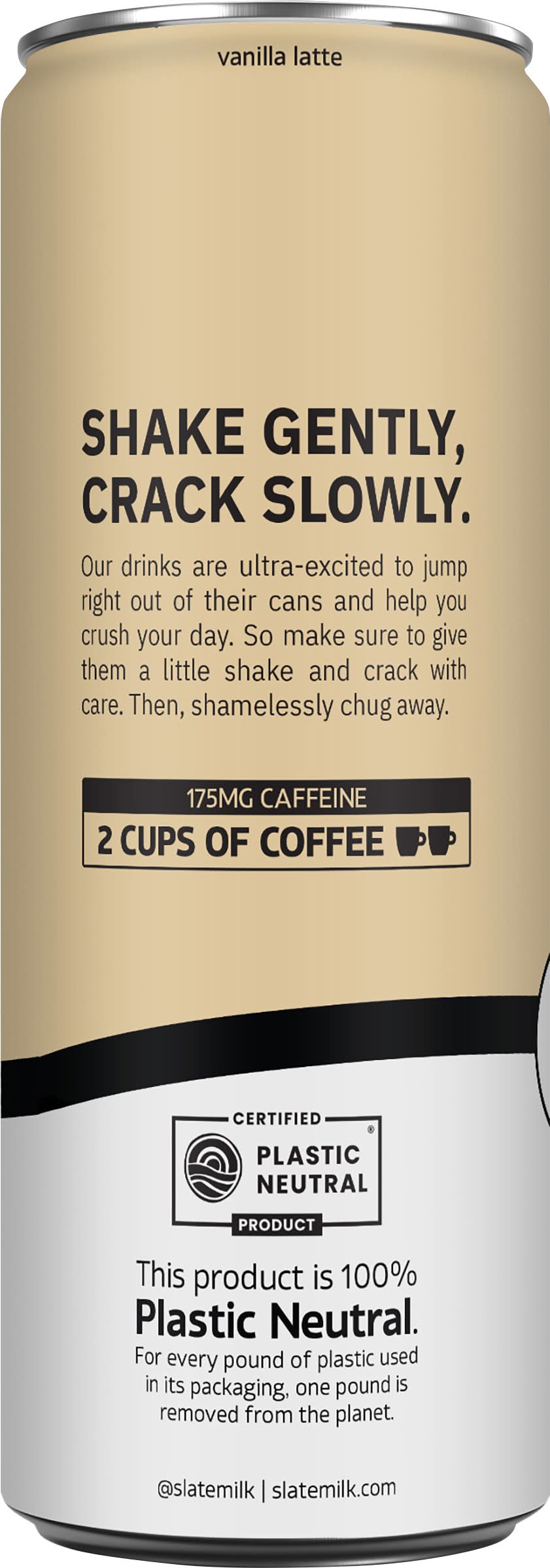 Naturally flavored coffee beverage. Nut free. Soy free. Sucralose free. Erythritol free. No carrageenan. Our drinks ultra excited to jump right out of their cans and help you crush your day. So make sure to give them a little shake and crack with care. Certified Plastic Neutral product. This product is 100% plastic neutral. For every pound of plastic used in its packaging, one pound is removed from the planet. • Flavor: Vanilla latte • Packaging: Reusable