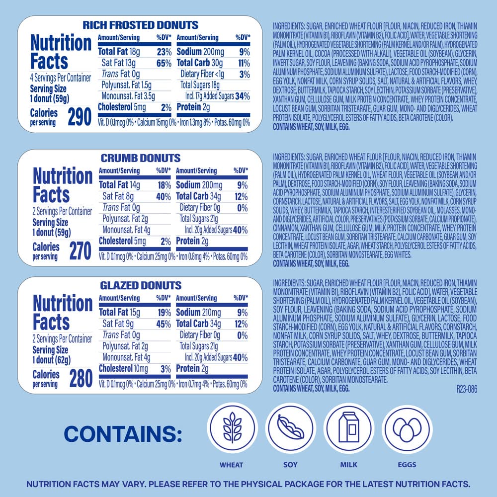 Ingredients: INGREDIENTS: SUGAR, ENRICHED WHEAT FLOUR [FLOUR, NIACIN, REDUCED IRON, THIAMIN MONONITRATE (VITAMIN B1), RIBOFLAVIN (VITAMIN B2), FOLIC ACID], WATER, VEGETABLE SHORTENING (PALM OIL), HYDROGENATED PALM KERNEL OIL, VEGETABLE OIL (SOYBEAN), SOY FLOUR, LEAVENING (BAKING SODA, SODIUM ACID PYROPHOSPHATE, SODIUM ALUMINUM PHOSPHATE, SODIUM ALUMINUM SULFATE), GLYCERIN, LACTOSE, FOOD STARCH-MODIFIED (CORN), EGG YOLK, NATURAL ARTIFICIAL FLAVORS, CORNSTARCH, NONFAT MILK, CORN SYRUP SOLIDS, SALT, WHEY, DEXTROSE, BUTTERMILK, TAPIOCA STARCH, POTASSIUM SORBATE (PRESERVATIVE), XANTHAN GUM, CELLULOSE GUM, MILK PROTEIN CONCENTRATE, WHEY PROTEIN CONCENTRATE, LOCUST BEAN GUM, SORBITAN TRISTEARATE, CALCIUM CARBONATE, GUAR GUM, MONO- AND DIGLYCERIDES, WHEAT PROTEIN ISOLATE, AGAR, POLYGLYCEROL ESTERS OF FATTY ACIDS, SOY LECITHIN, BETA CAROTENE (COLOR), SORBITAN MONOSTEARATE. Contains: CONTAINS EGG, MILK, SOY, WHEAT.