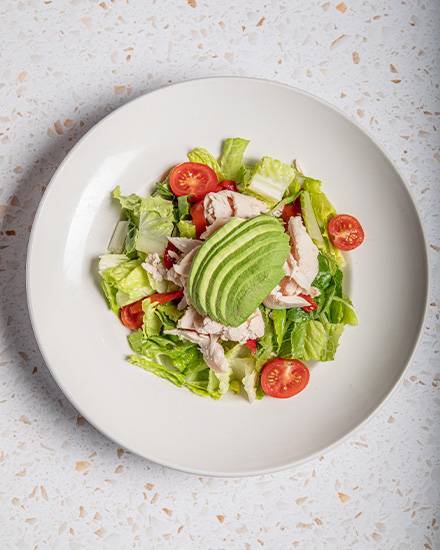Pulled oven-roasted chicken, tomato, roasted red pepper, and avocado over hearts of romaine lettuce with green goddess dressing.