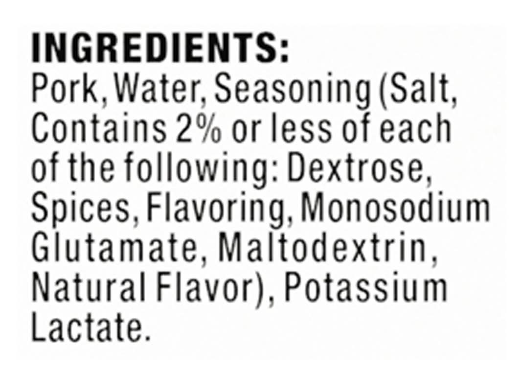 Ingredients: Pork, Water, Seasoning (Salt, Contains 2% or Less of Each of the Following: Dextrose, Spices, Flavoring, Monosodium Glutamate, Maltodextrin, Natural Flavor), Potassium Lactate