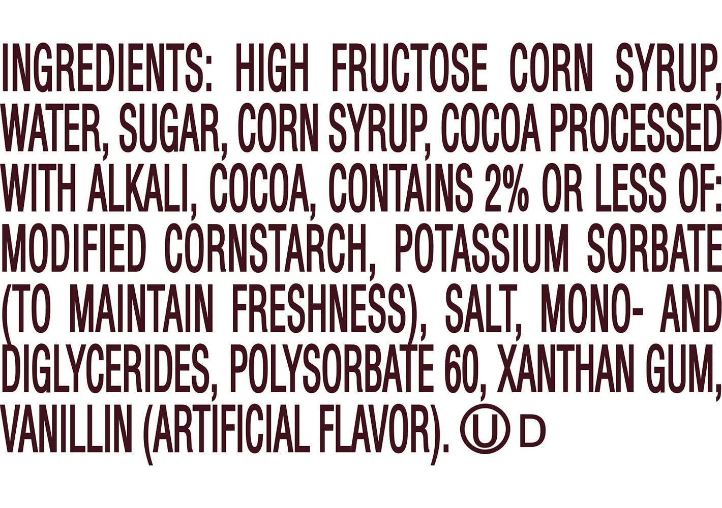 Ingredients: HIGH FRUCTOSE CORN SYRUP, WATER, SUGAR, CORN SYRUP, COCOA PROCESSED WITH ALKALI, COCOA, CONTAINS 2% OR LESS OF: MODIFIED CORNSTARCH, POTASSIUM SORBATE (TO MAINTAIN FRESHNESS), SALT, MONO- AND DIGLYCERIDES, POLYSORBATE 60, XANTHAN GUM, VANILLIN (ARTIFICIAL FLAVOR), . Contains: Contains: Does Not Contain Any Of The 8 Major Allergens
