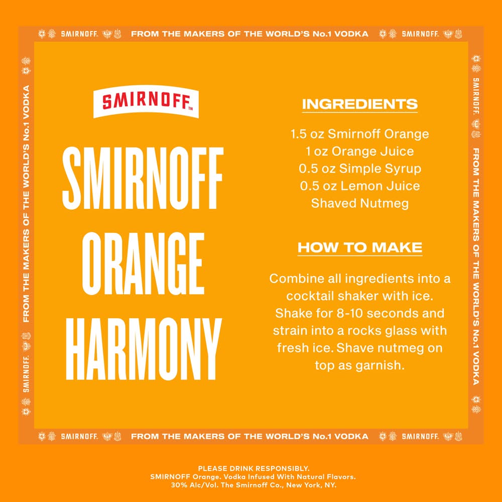 Freshen up your summer drinks with the vibrant taste of Smirnoff Orange. Infused with a variety of delicious orange flavors this spirit delivers a zesty citrus taste. It is smooth enough to be enjoyed neat and revitalizes the most simple of cocktails. Mix Smirnoff Orange with cranberry juice or pineapple juice and serve over ice for a delicious Crushed Orange cocktail, or simply enjoy it with soda water and an orange twist. The fruity versatility of Smirnoff Orange makes it a great choice for any occasion. Includes one 60 proof. Please enjoy responsibly. • Flavor: Orange • Alcohol by volume: 30% • Packaging: Reusable