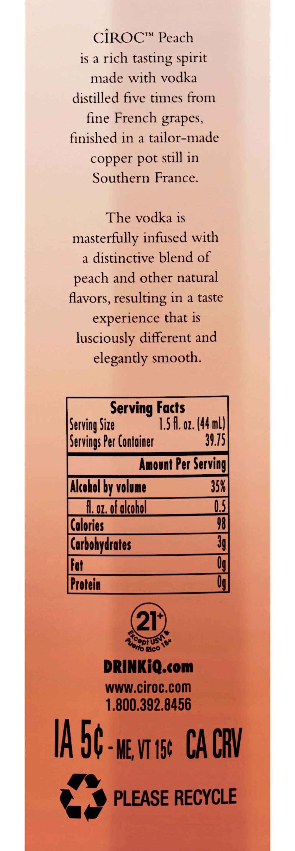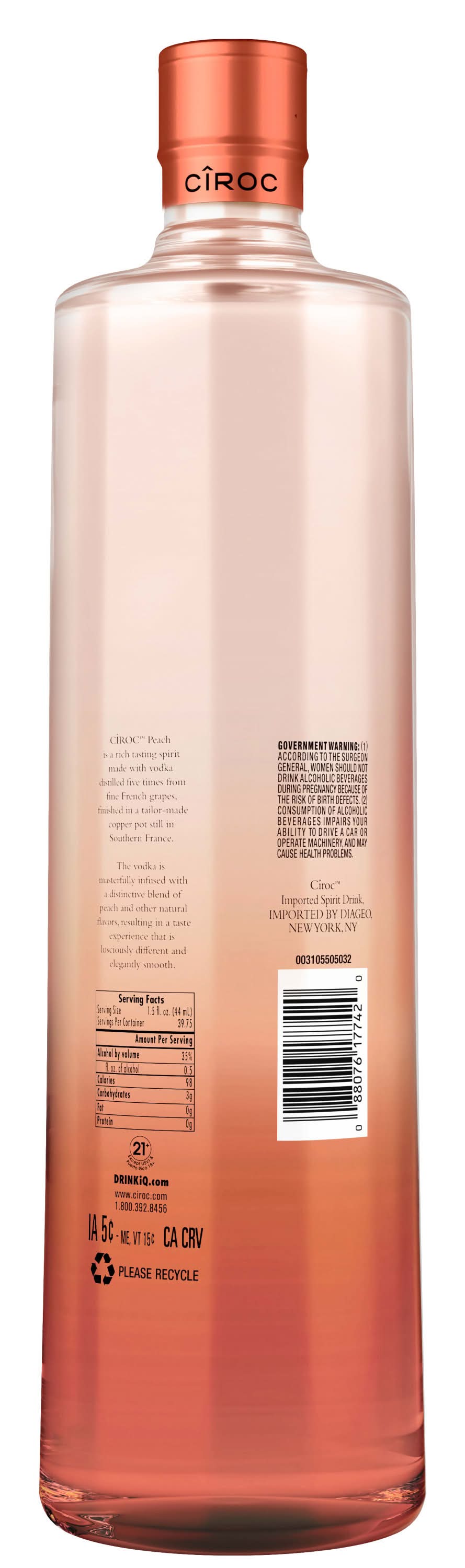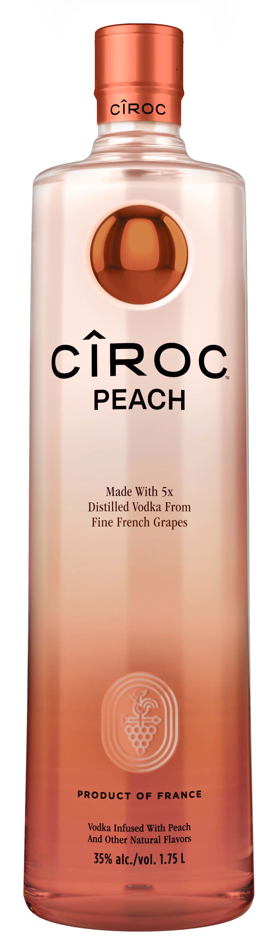 CIROC Peach is a rich tasting spirit made with vodka distilled five times from fine French grapes, finished in a tailor-made copper pot still in Southern France. This spirit is masterfully infused with a distinctive blend of peach and other natural flavors, resulting in a taste experience that is lusciously different and elegantly smooth. Perfect for a Peach Bellini cocktail. CIROC was named One of the World’s Best-Selling Vodkas at the 2020 Drinks International awards. Includes one 70 proof 1.75 L bottle of CIROC Peach. Please drink responsibly. Alcohol by volume: 35%