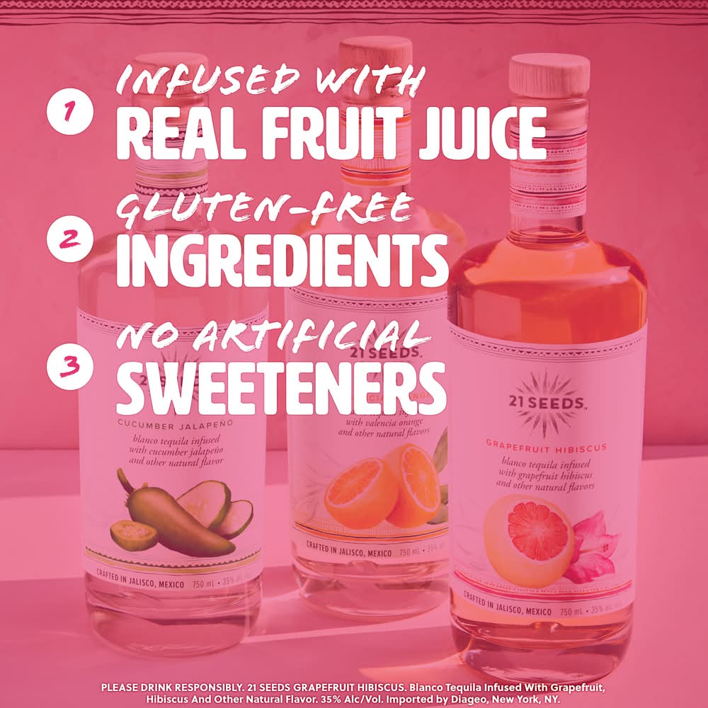 Experience the luxury of simplicity with 21Seeds Grapefruit Hibiscus Infused Tequila. With soft, citrus-forward notes and a floral hint, this tequila blanco is infused with natural flavors for a fruity taste without being sugary. 21Seeds crafts its award-winning tequila alcohol by slow cooking agaves from Jalisco. The double distilling and cold filtering processes result in a blanco base ready to be infused with the juice of real fruit for the perfect tequila gift with incredible taste. Perfect for an easy Seed & Soda cocktail. Includes one 70 proof bottle of 21Seeds Grapefruit Hibiscus Infused Tequila. Please drink responsibly. • Flavor: Grapefruit hibiscus • Alcohol by volume: 35% • 21Seeds Spirits, Miami, FL. Product of Mexico.