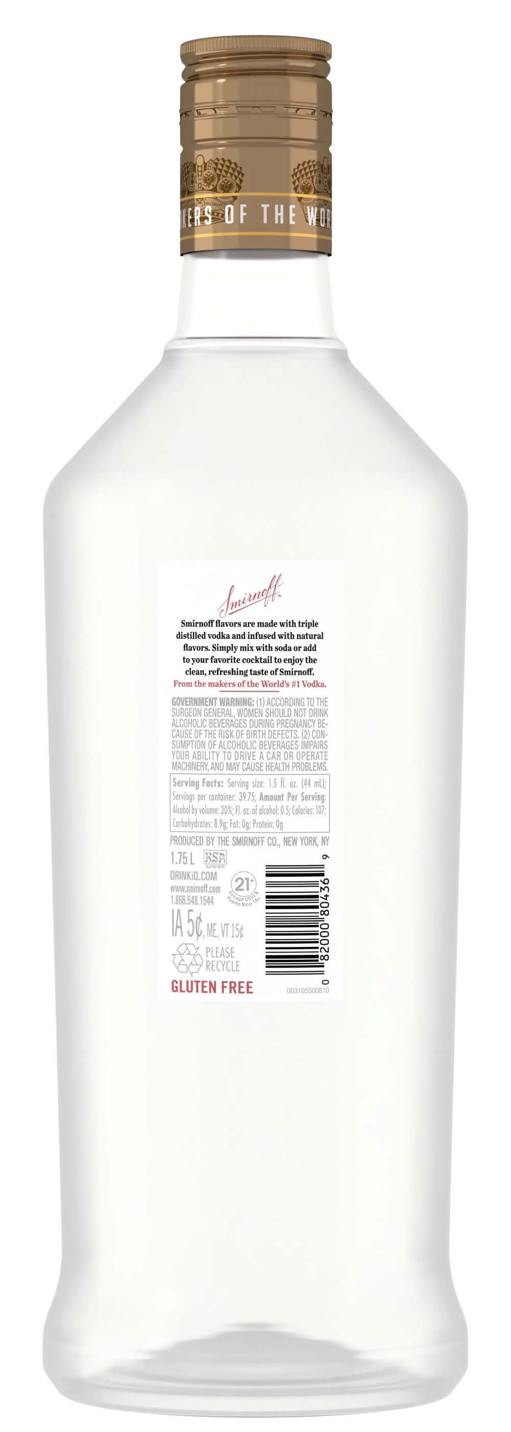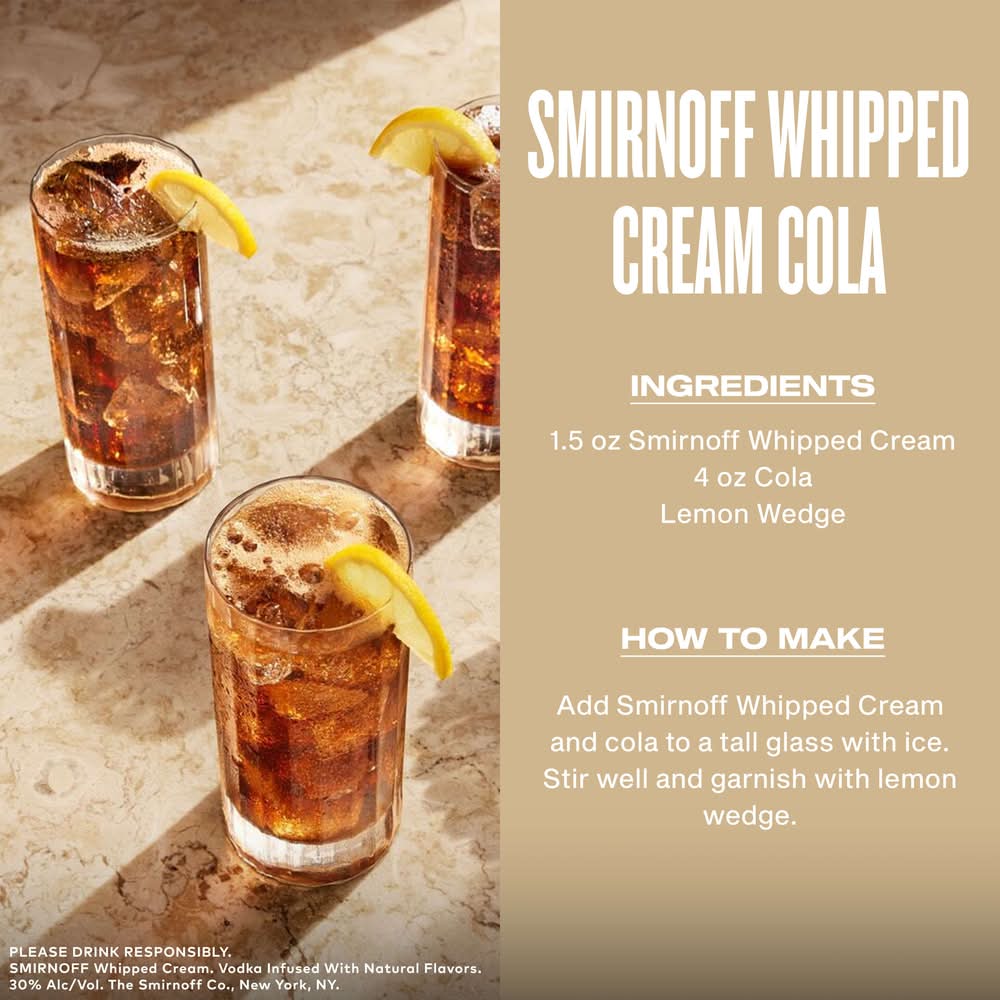 Take your cocktail party to a new level with delicious Smirnoff Whipped Cream. Offering a light yet decadent taste, this spirit adds a sweet hit to any drink and is smooth enough to be enjoyed on the rocks and as a shot. Mix with root beer or ginger ale for a creamy, easy-to-make cocktail, or combine with coffee for the perfect after-dinner treat. Even better, each bottle of Smirnoff Whipped Cream is Certified Kosher and gluten-free so no one has to miss out. Includes one 60 proof 1.75 L bottle of Smirnoff Whipped Cream that utilizes 20% recycled plastic. Please enjoy responsibly. • Flavor: Whipped cream • Alcohol by volume: 30%