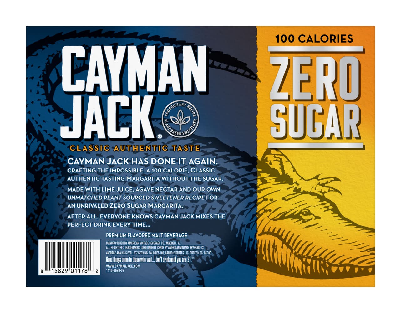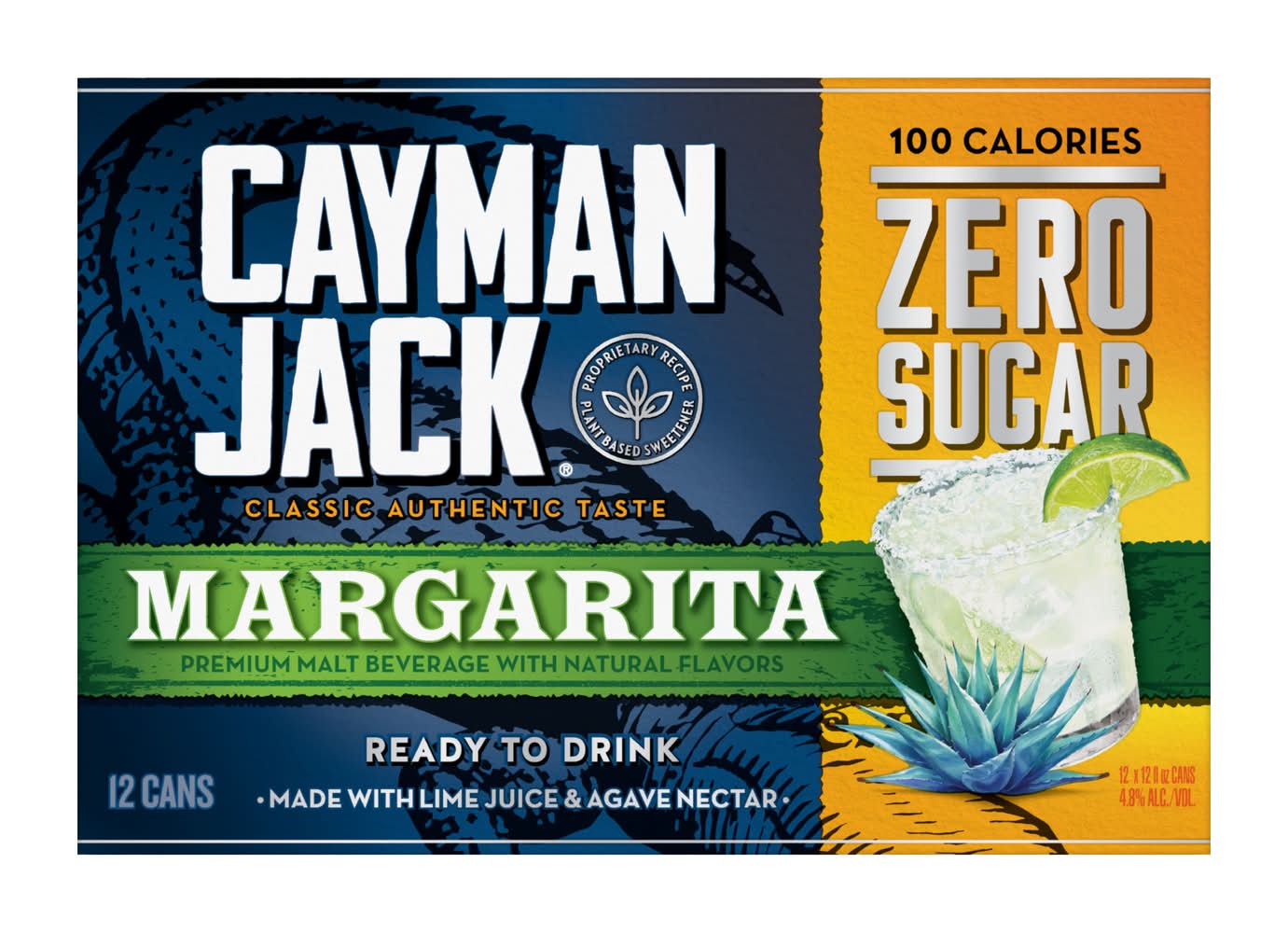 Cayman Jack® Zero Sugar Margarita is a refreshing, pre-made drink that delivers a unique, sophisticated and hand-crafted experience. Yes, Cayman Jack® has done the impossible: a zero sugar, authentic tasting margarita flavor! This refreshing combination of zesty lime juice notes and sweet 100% blue agave nectar has that margarita taste you love – all with zero sugar and 100 calories per 12oz serving, at 4.8% ABV. And made with our own unmatched plant sourced sweetener recipe, there’s no compromise on flavor. Cayman Jack® Zero Sugar Margarita offers authentic margarita taste! Great for sipping chilled or on the rocks – this premium drink delivers that exceptional taste that you love. The Cayman Jack® Zero Sugar Margarita tastes like it was hand-crafted right in front of you. Cayman Jack® is a Premium Malt Beverage with Natural Flavors. Available in 12oz 12pk cans. Discover the legend of Cayman Jack and learn more about our other drink flavors at www.caymanjack.com. • Pack size: 12 • Alcohol by volume: 4%