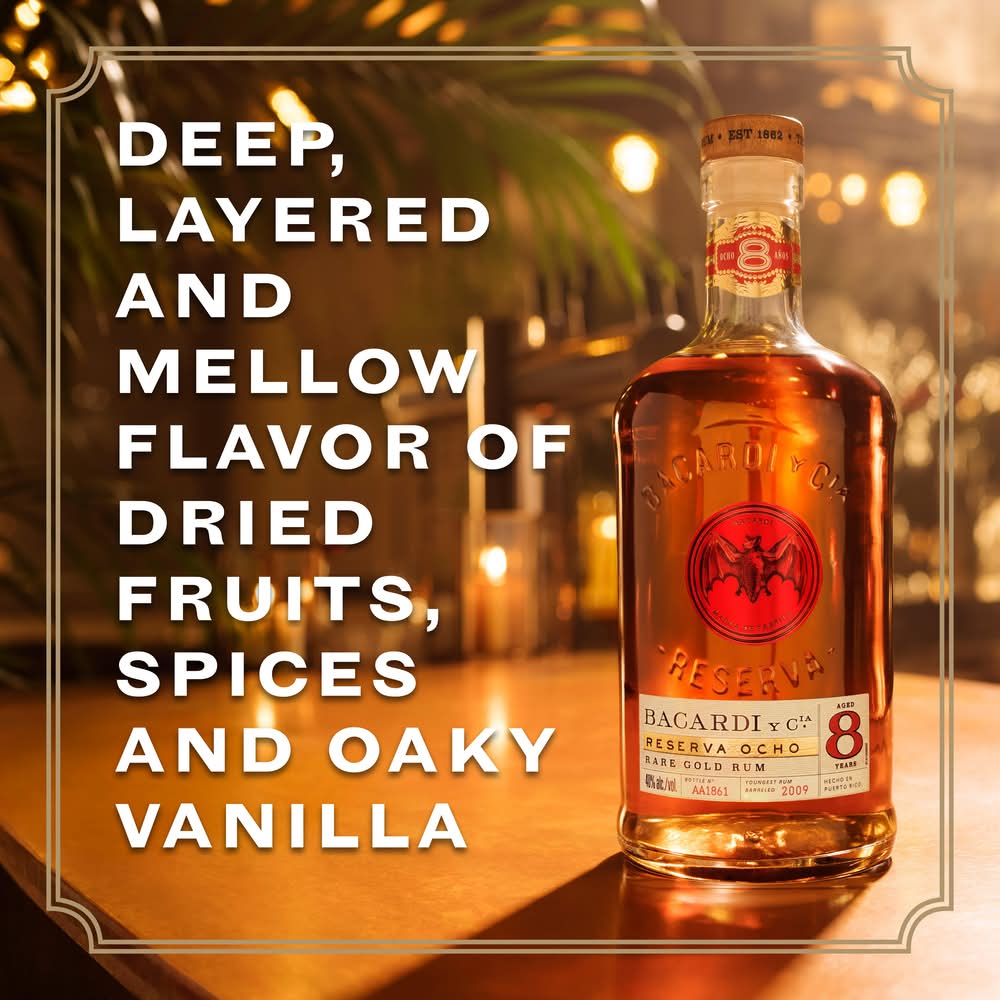 Created in 1862, bacardi reserva ocho rum is one of the oldest private rum blends in the world. For seven generations, the bacard family enjoyed it as their personal reserve. Happily, today everyone can enjoy this golden sipping rum and create special moments together. Alcohol by volume: 40%