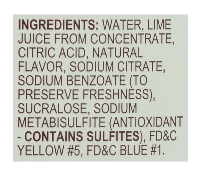Ingredients: Water, Lime Juice from Concentrate, Citric Acid, Natural Flavor, Sodium Citrate, Sodium Benzoate (to Preserve Freshness), Sucralose, Sodium Metabisulfite (Antioxidant - Contains Sulfites), FD&C Yellow 5, FD&C Blue 1 Contains: Sulfites