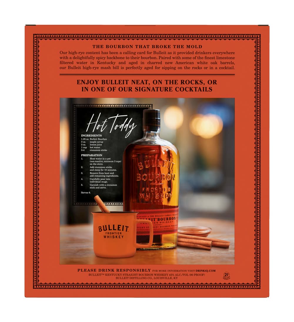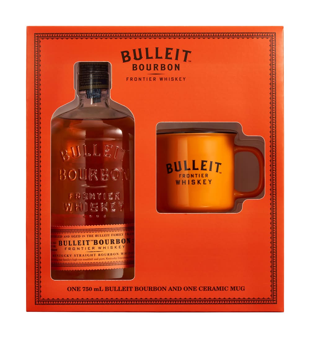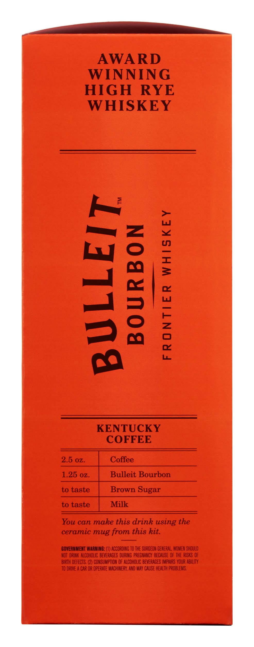Enjoy the pioneer-inspired Bulleit Bourbon Whiskey crafted from ingredients of the very highest quality at home or on the range with this limited edition set including a ceramic mug. The complexity of Bulleit Bourbon comes from its unique blend of rye, corn, and barley malt, along with special strains of yeast and pure Kentucky limestone-filtered water. Due to its especially high rye content, Bulleit Bourbon has a bold, spicy character with a finish that's distinctively clean and smooth. Medium amber in color, with gentle spiciness and sweet oak aromas, the mid-palate is smooth with tones of maple, oak, and nutmeg. The finish is long, dry, and satiny with a light-tasting toffee flavor that lingers long after the final sip. Bulleit Bourbon earned a Gold medal at the 2021 San Francisco World Spirits Competition. Perfect for a Bulleit Old Fashioned. Includes one 90 proof 750 mL bottle of Bourbon Whiskey with a branded ceramic mug. Please drink responsibly. Alcohol by volume: 45%