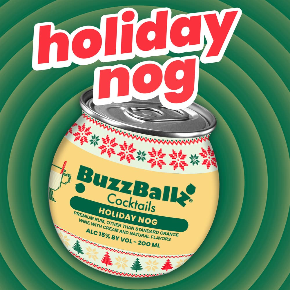 Deck the Hallz with BuzzBallz Holiday Nog Cocktails. This seasonal BuzzBall is wrapped in a cozy ugly sweater and packed with comforting sweet vanilla and nutmeg flavors. Get some holiday Ballz for your tree with BuzzBallz Holiday Nog Cocktails. • Flavor: Eggnog • Alcohol by volume: 15%
