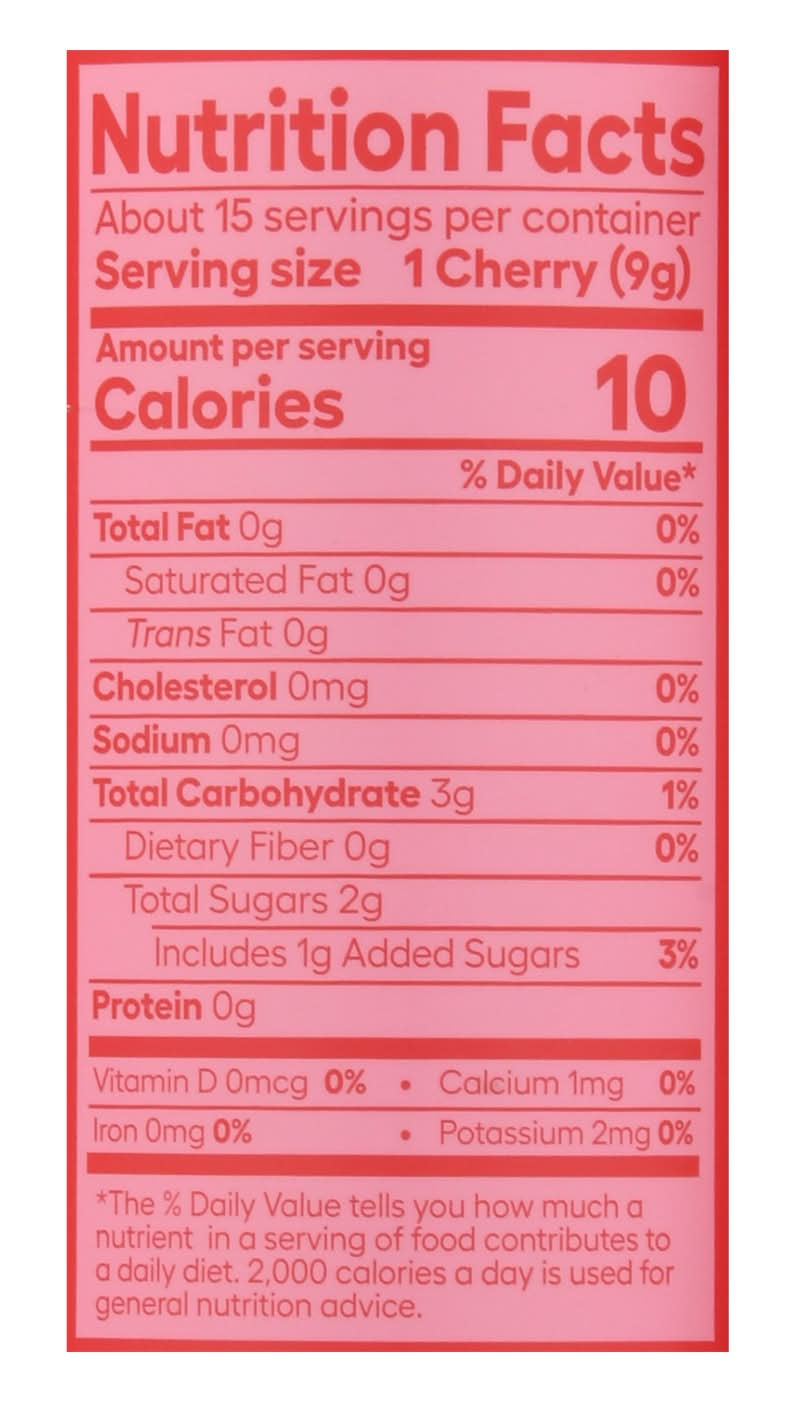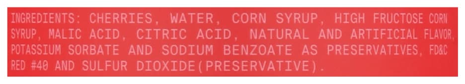 Ingredients: Cherries, Water, Corn Syrup, High Fructose Corn Syrup, Malic Acid, Citric Acid, Natural and Artificial Flavor, Potassium Sorbate and Sodium Benzoate as Preservatives, FD&C Red 40 and Sulfur Dioxide( Preservative) Contains: Corn