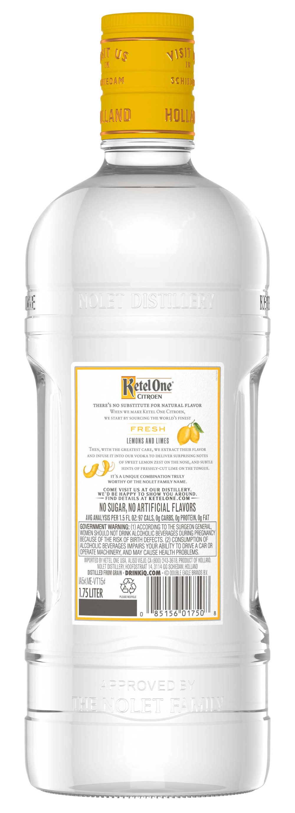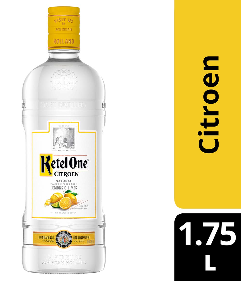 There's no substitute for natural flavor, that's why when we make Ketel One Citroen, we start by sourcing the world's finest fresh lemons and limes. Then, with the greatest care, extract the crisp, tangy flavor and infuse it into our vodka to deliver surprising notes of sweet lemon zest on the nose and subtle hints of freshly-cut lime on the tongue. It's a unique combination truly worthy of the Nolet family name. Our 80 proof vodka is meticulously crafted using non-GMO grain for smoothness and is distilled in copper pot stills for a unique and refreshing tasting finish. This vodka is perfect for sipping on its own or added with your favorite cocktail. Perfect for any vodka soda. Includes one 80 proof 1.75 L bottle of Ketel One Citroen Flavored Vodka. Please drink responsibly. • Flavor: Citroen • Alcohol by volume: 48%