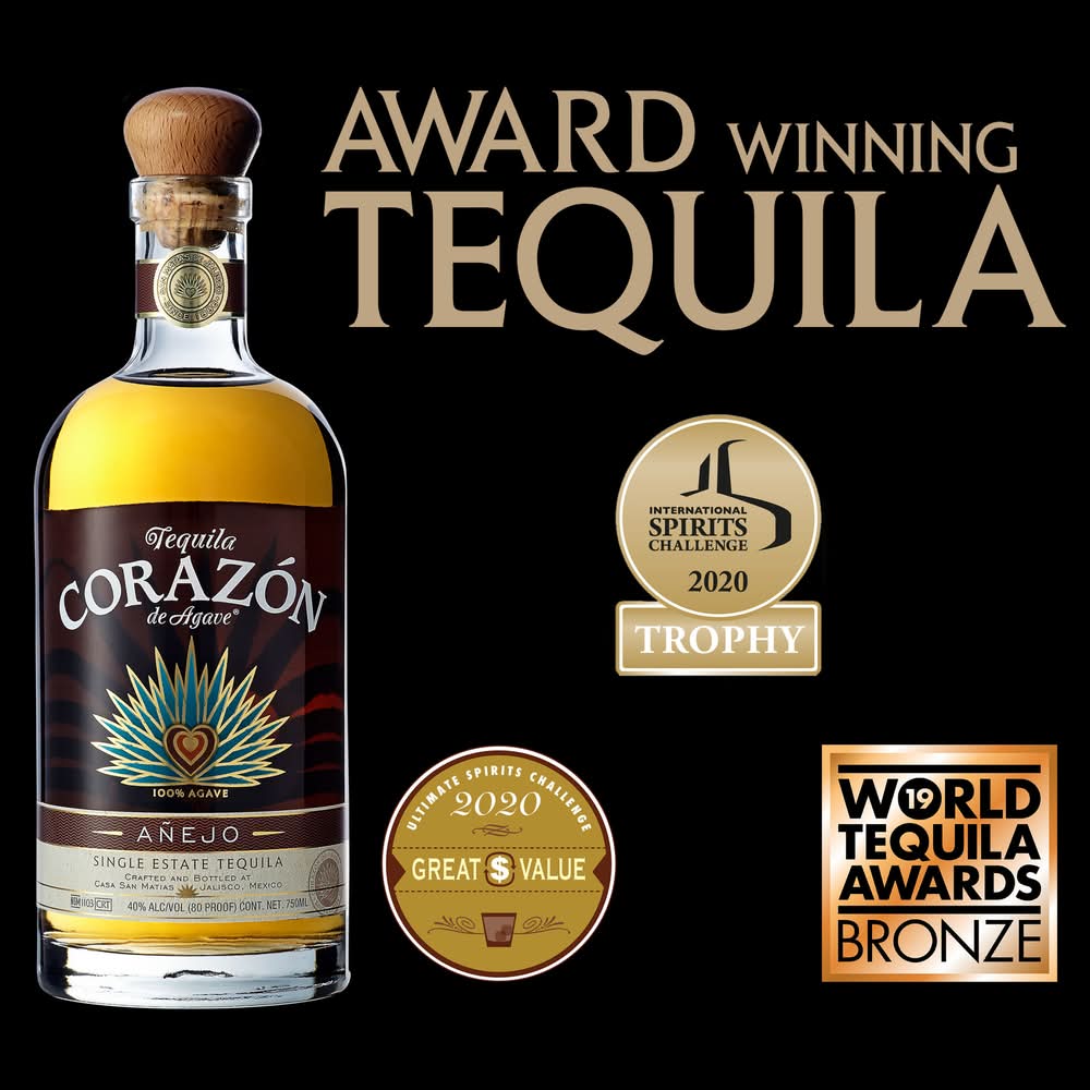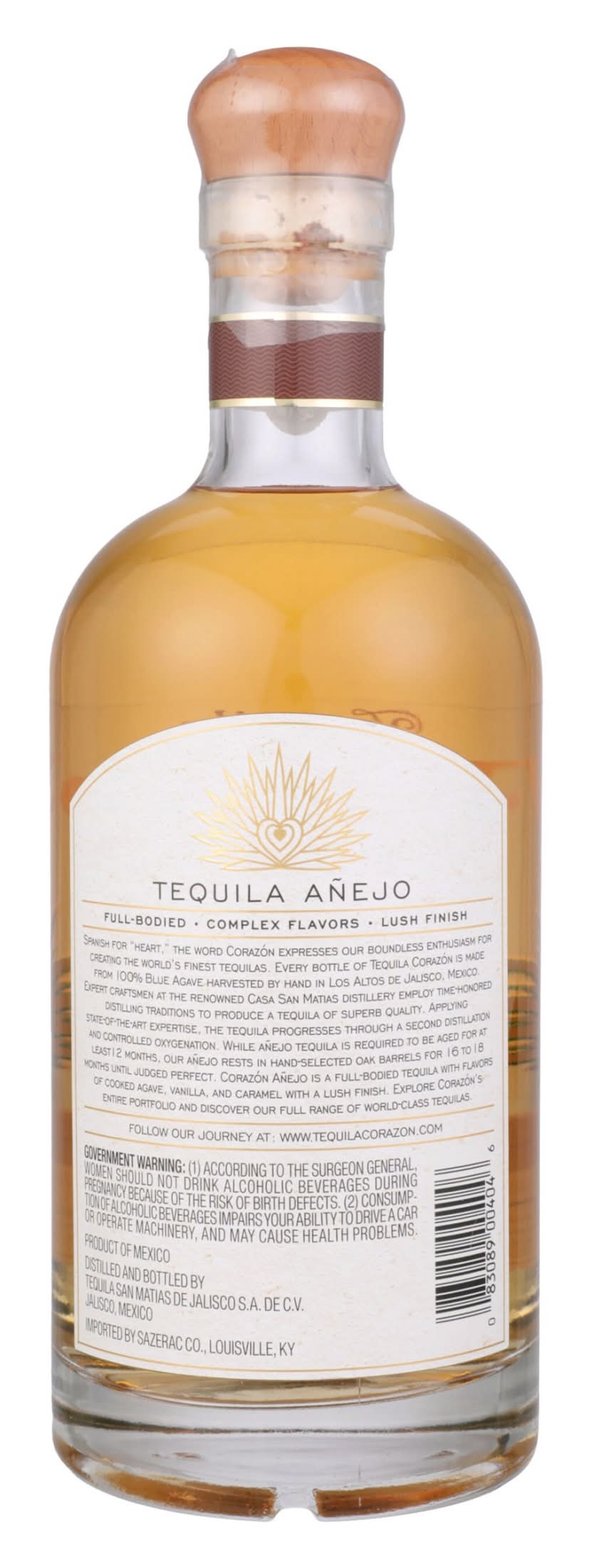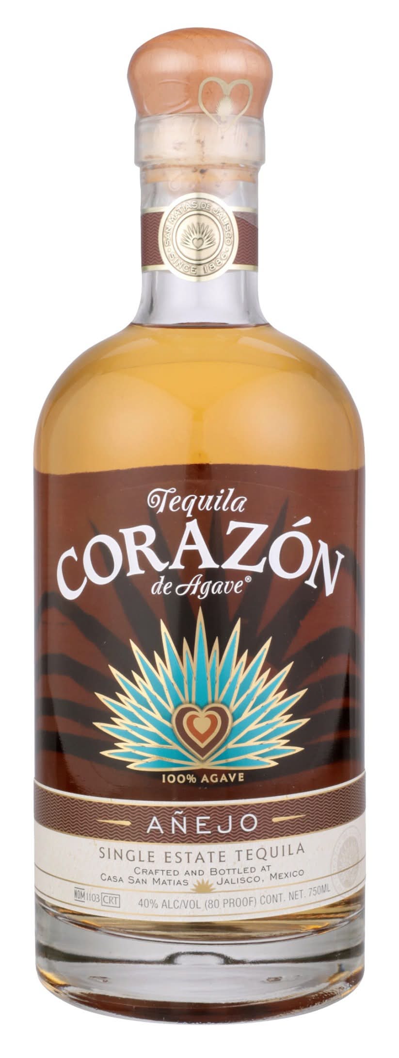 Taste the Heart of the Highlands of Jalisco with Corazon Anejo Tequila. Made from 100% superior highlands blue Weber agave, Corazon Anejo Tequila is produced through traditional craft methods with zero additives. Aged 16 to 18 months, this anejo tequila features tasting notes of cooked agave, vanilla and caramel with a lush finish. A second distillation process of this blue agave tequila achieves an incomparable richness. Enjoy the authentic flavor of this 80 proof liquor straight or in your favorite tequila cocktails, from a paloma to margaritas, frozen or on the rocks. Store Corazon Anejo Tequila at room temperature or store in the freezer to enjoy this blue agave spirit chilled. Corazon Tequila. Heart Matters. Alcohol by volume: 40%