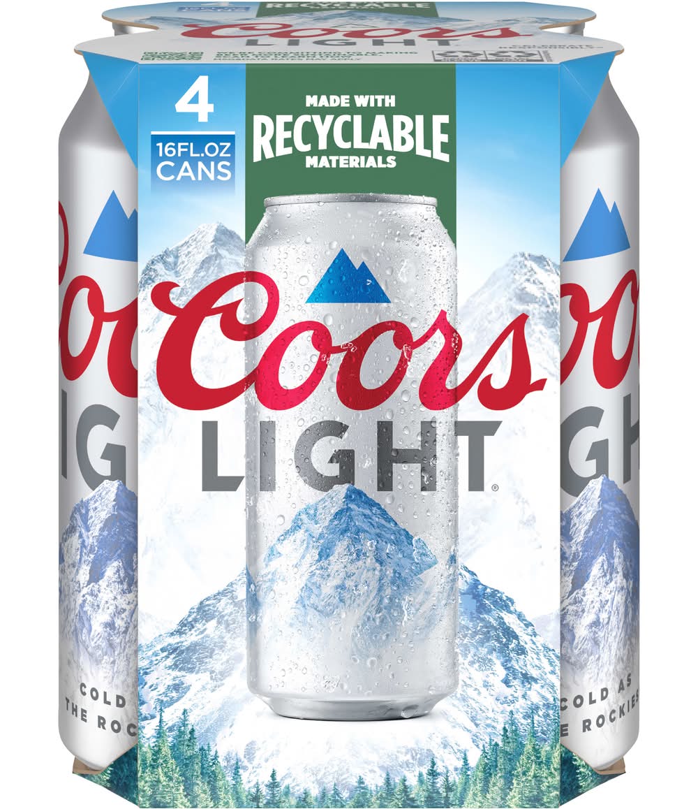 Crisp, clean and refreshing, Coors Light is an American-style light lager beer. This light beer has 4.2% ABV, 102 calories and 5 grams of carbs per 12-ounce serving. Full of Rocky Mountain refreshment, this light-calorie beer provides a light body with clean malt notes and low bitterness. Share this 4-pack of beer with friends and family all year long when you’re in need of refreshing drinks. Not only is Coors Light golden beer crafted with pure water, lager yeast, two-row barley malt, and four hop varieties, but it's cold lagered, cold filtered, and cold packaged to deliver an unforgettable beer-drinking experience. A carry case of Coors Light beer cans makes for great party drinks or for tailgating, barbecues, and any holiday that calls for beer. Coors Light American Lager takes pride in its process and ingredients that make it The World’s Most Refreshing Beer. • Pack size: 4 • Alcohol by volume: 4.2%