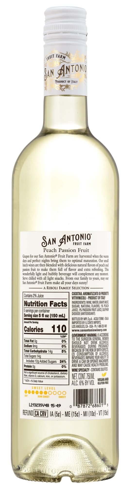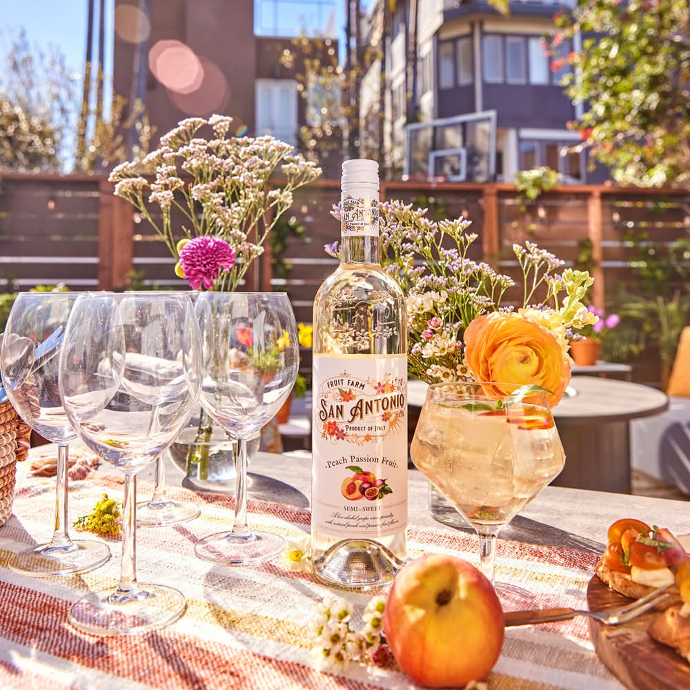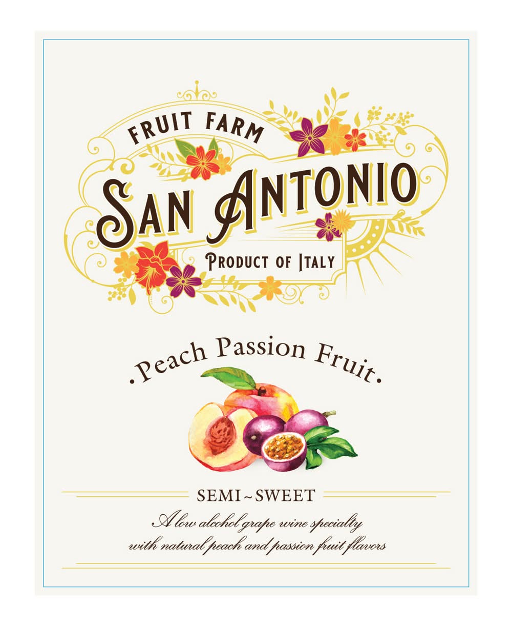 San Antonio Fruit Farm is proudly crafted by Italian oenologists Paola and Ivana, who share an enthusiasm for both the long-standing traditions of Italian winemaking, and the opportunity to create new flavors, blends, and techniques. Fruit Farm Peach Passion Fruit is the center of attention at the birthday weekend, star of the BBQ, and total hit at your next impromptu hang. It’s handcrafted with White Moscato grapes harvested from our northern hillside vineyards in Piedmont, Italy. Peach-passion fruit juice, made using all natural whole fruits, is then blended to create a delicate yet rich flavor profile. Instantly turn an ordinary day into a mini vacay with a bottle of Peach Passion Fruit. Naturally crafted with two fruits. Serve chilled with light snacks. • Flavor: Peach passion fruit • Features : vegan • Alcohol by volume: 6% • Number of servings: 5