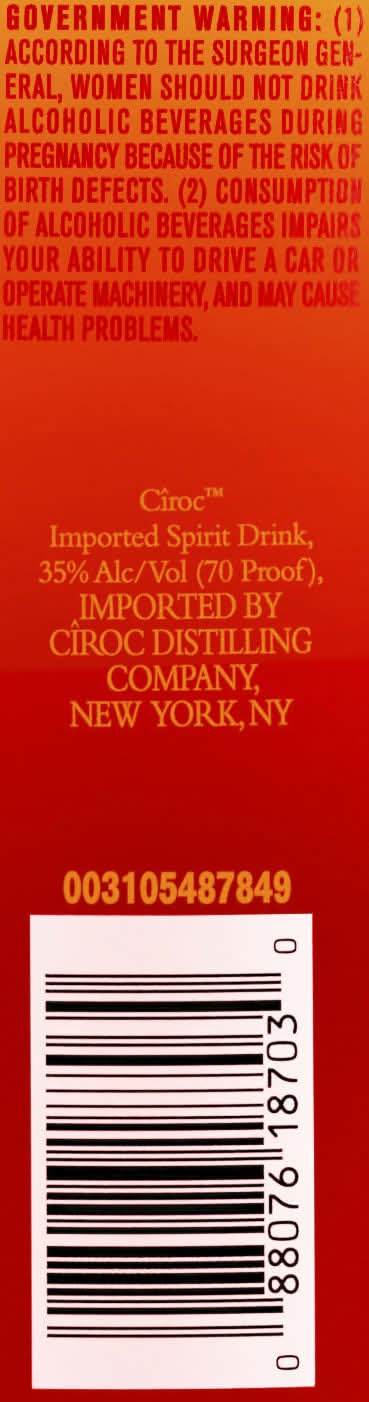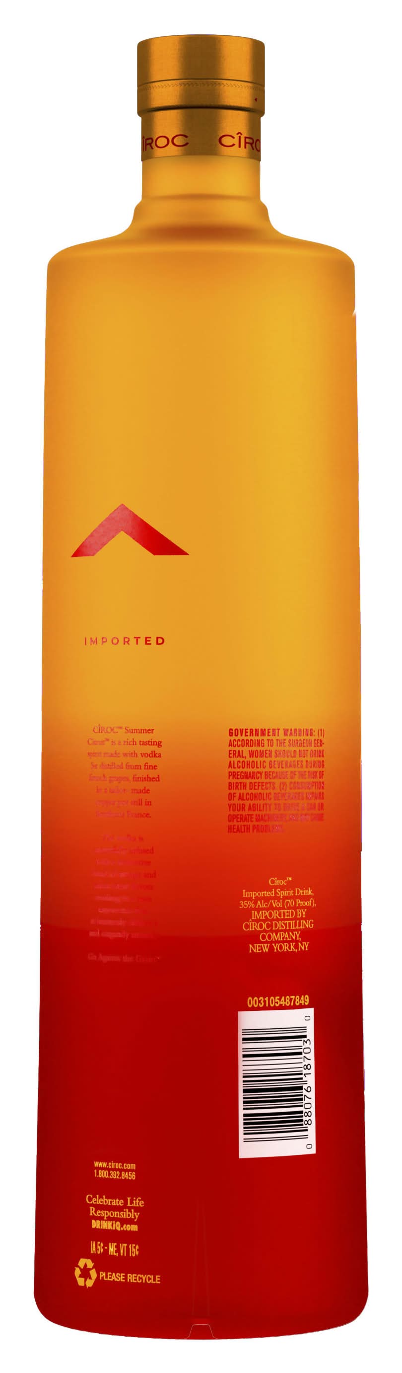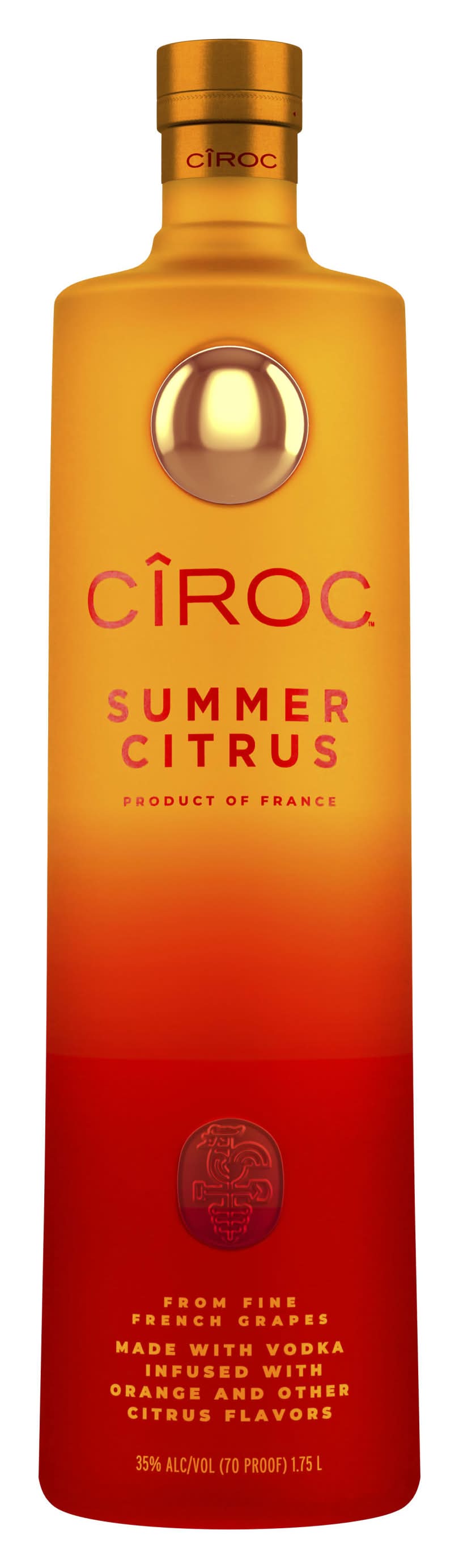 Drink in the bright tastes of summertime with CIROC Summer Citrus. Our rich-tasting spirit is made with vodka distilled five times from fine French grapes, and is finished in a tailor-made copper pot still in Southern France. Featuring a distinctive citrus taste imparted by the grapes, CIROC Summer Citrus is masterfully infused with a blend of orange and other tangy, citrus flavors. The sun-kissed nose of bright, juicy orange and hints of lime zest culminate in a silky-smooth, full-bodied finish. Bursting with vibrant flavor, our Summer Citrus is perfect for relaxing at home or by the pool. Perfect for any vodka soda. Includes one 70 proof 1.75 L bottle of CIROC Summer Citrus. Please drink responsibly. • Alcohol by volume: 35% • Packaging: Reusable