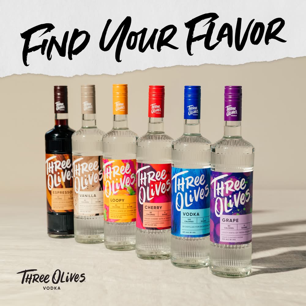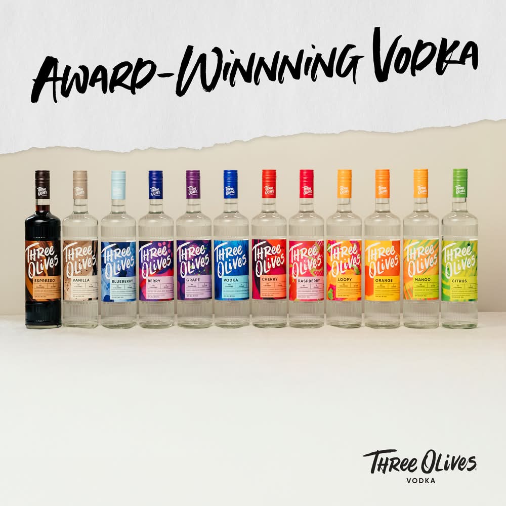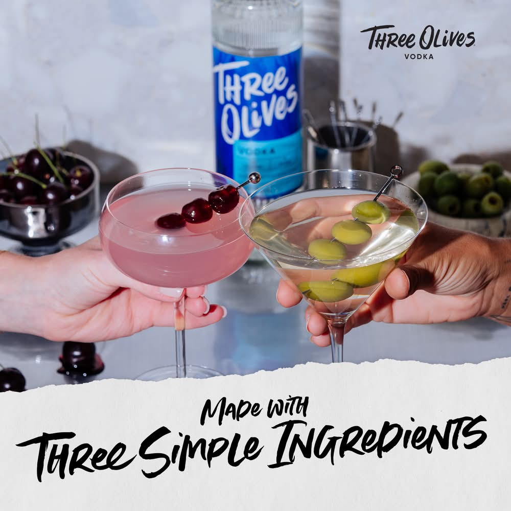 Three Olives® Cherry Vodka has a sweet red cherry aroma with the flavor of juicy and tart maraschino cherries. Zero sugar, 80 calories and gluten free, Three Olives® Cherry is perfect in a shot or for any cocktail. (Crafted with all-natural flavors; 30% ABV – 60 proof). At the base of all Three Olives® flavors is an award-winning, premium vodka 5x distilled, yielding an exceptionally smooth vodka that is zero sugar, low calorie, and gluten free. Made in the USA. • Alcohol by volume: 35% • Proximo, Lawrenceburg, IN • Packaging: Reusable