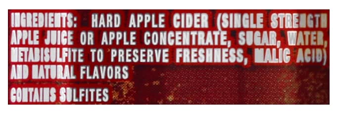 Ingredients: Hard Apple Cider (Single Strength Apple Juice or Apple Concentrate, Sugar, Water, Metabisulfite to Preserve Freshness, Malic Acid) and Natural Flavors