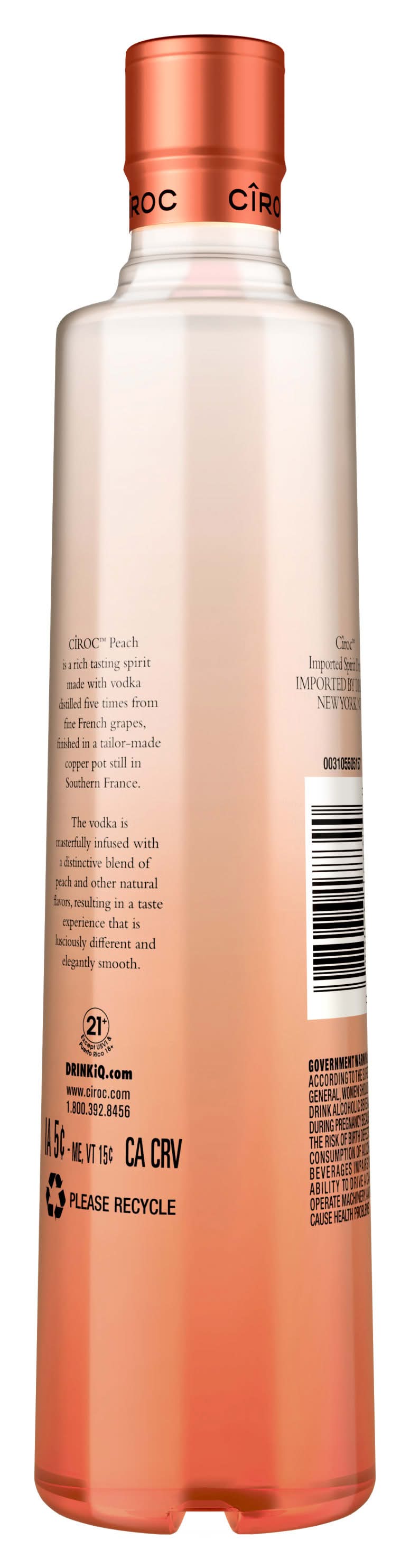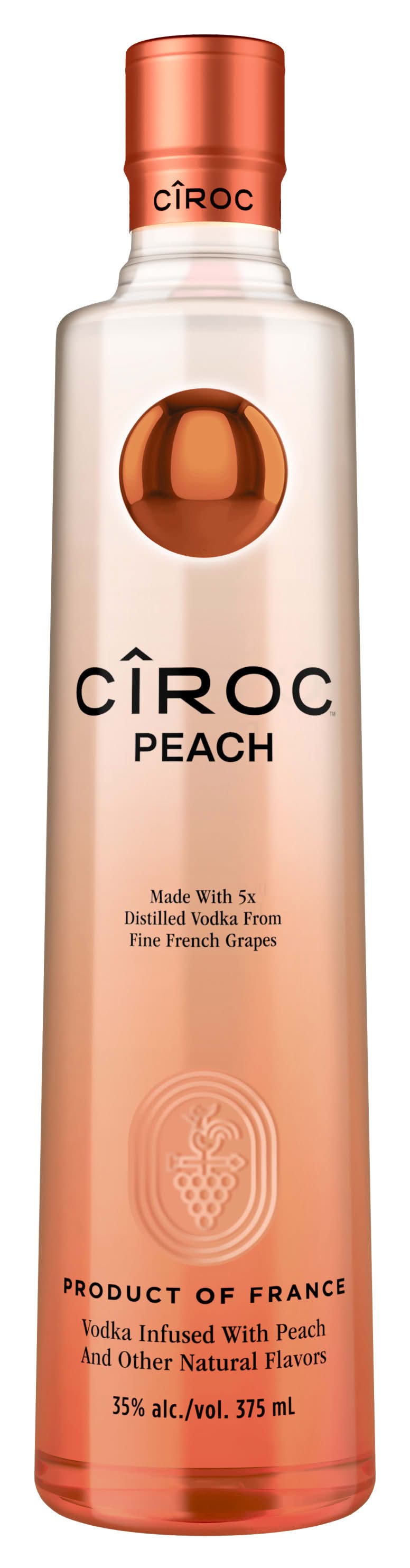 Ciroc Peach is a rich-tasting spirit made with vodka distilled five times from fine French grapes and finished in a tailor-made copper pot still in Southern France. This spirit is masterfully infused with a distinctive blend of peach and other natural flavors, resulting in a taste experience that is lusciously different and elegantly smooth. Perfect for a Peach Bellini cocktail. • Flavor: Peach • Alcohol by volume: 35%