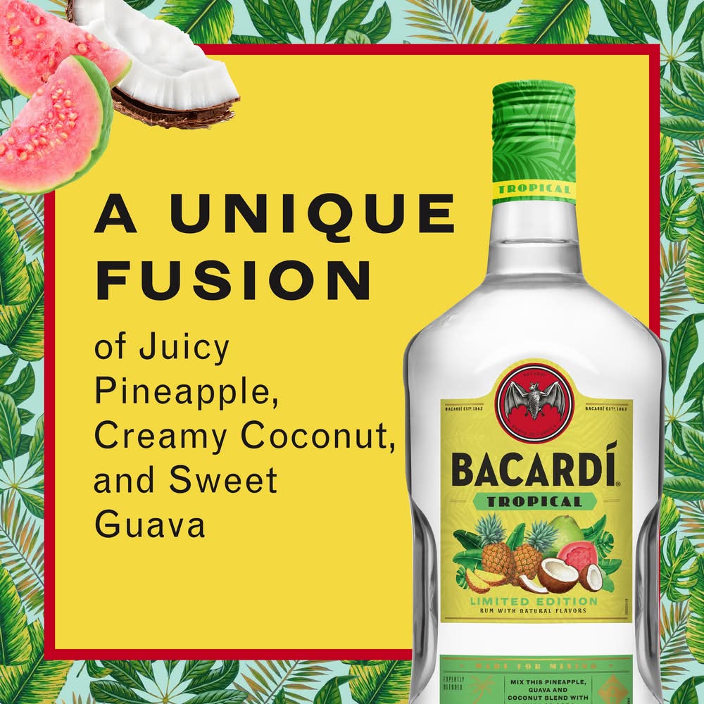 Bacardi Tropical is a perfectly balanced blend of juicy pienapple, creamy coconut, and sweet guava. Nothing tastes more like summer than this limited edition, authentic Bacardi Caribbean flavor that mixes well with juices and sodas. Alcohol by volume: 35%