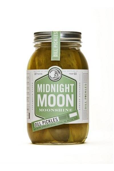 Midnight Moon Dill Pickles Moonshine is a 60 proof spirit that combines the smoothness of moonshine with the savory taste of real pickles, offering a unique flavor reminiscent of a beloved deli garnish. This product is presented in a 750ml bottle. Alcohol by volume: 30%