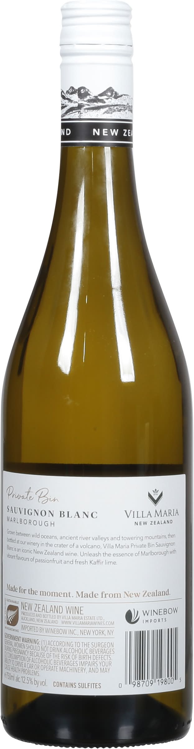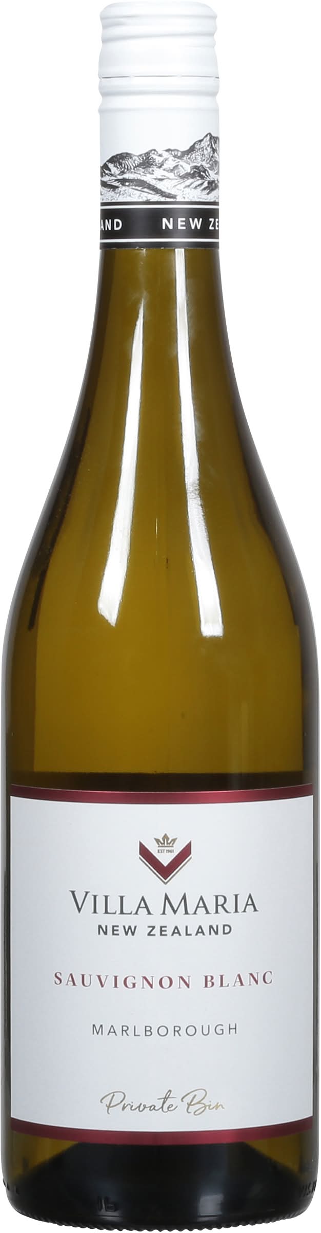 Est. 1961. 2021. Private Bin. Grown between wild oceans, ancient river valleys and towering mountains, then bottled at our winery in the crater of a volcano, Villa Maria private bin Sauvignon blanc is an iconic New Zealand wine. With the crack of the screw cap taste it for yourself as you unleash the essence of Marlborough and vibrant flavors of passionfruit and fresh Kaffir lime. www.villamaria.com. Made from New Zealand. Produced and Bottled by Villa Maria Estate LTD., Auckland, New Zealand. • Alcohol by volume: 13.5% • 2021