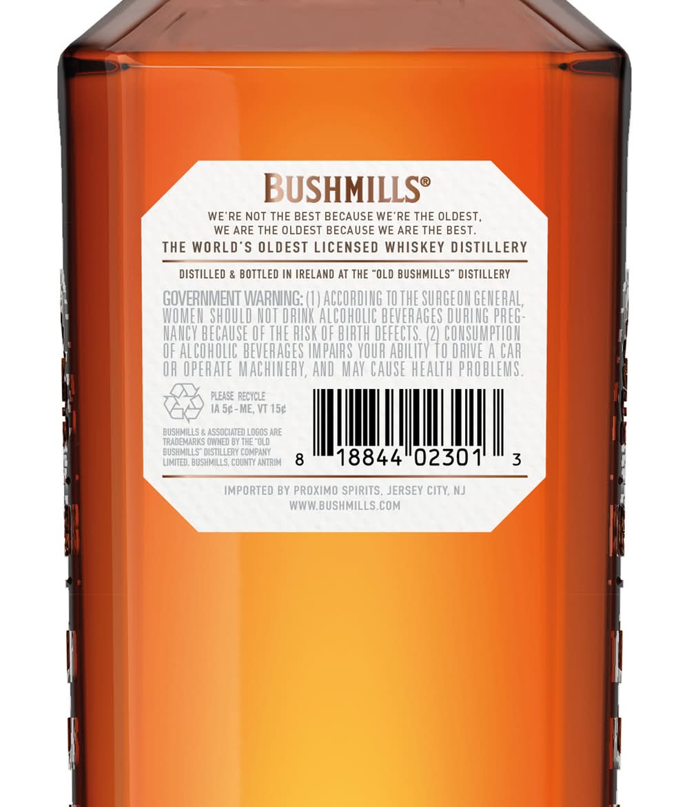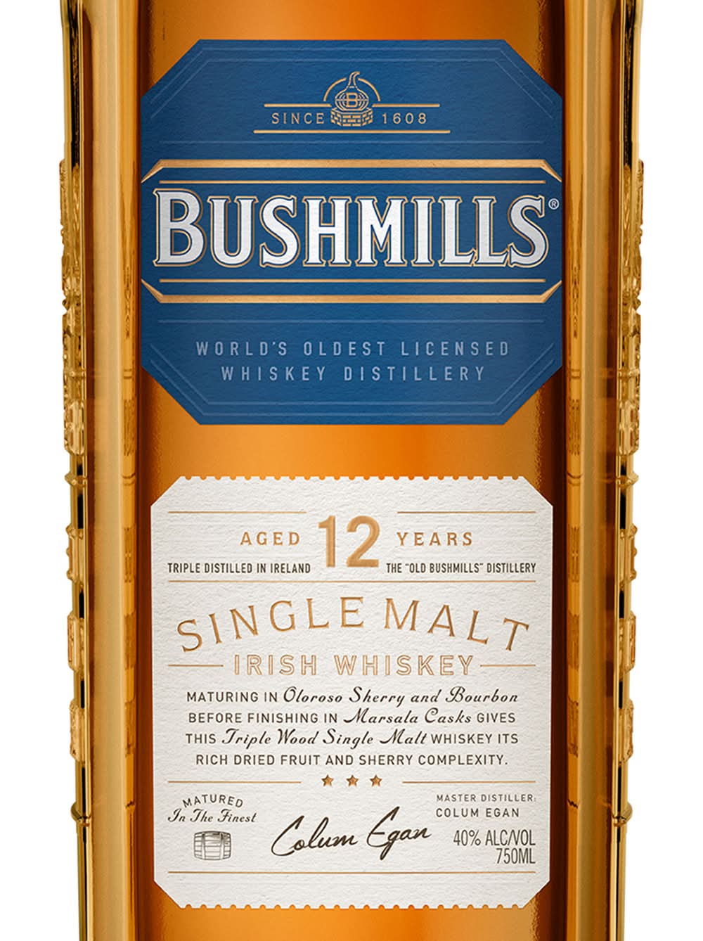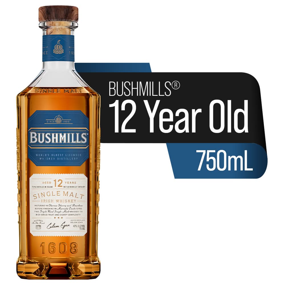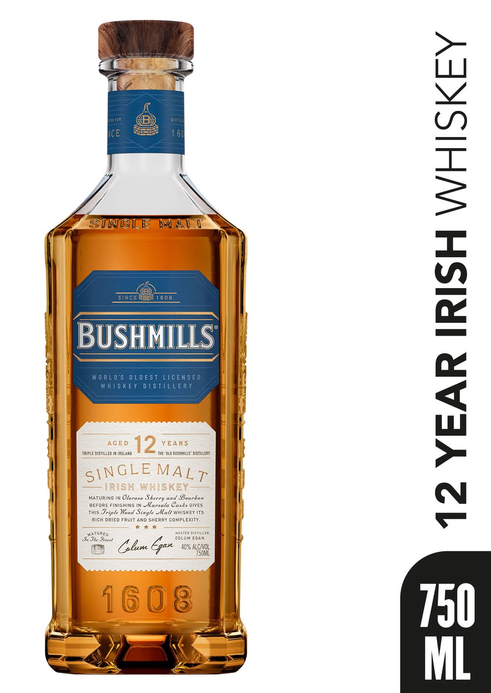 Bushmills 12 year old is 100% malted barley, triple-distilled, then aged for 10 years individually in seasoned bourbon barrels and sherry casks before being married into an extremely smooth whiskey. Bushmills single malt is a tradition passed down for generations and one of the world's great whiskeys. 90 Points Whiskey Advocate (40% ABV – 80 proof) Alcohol by volume: 40%