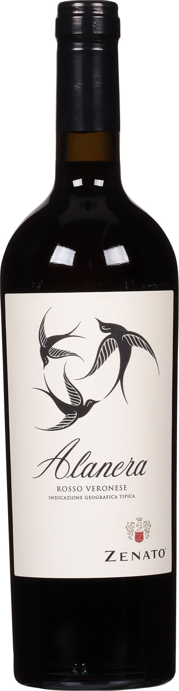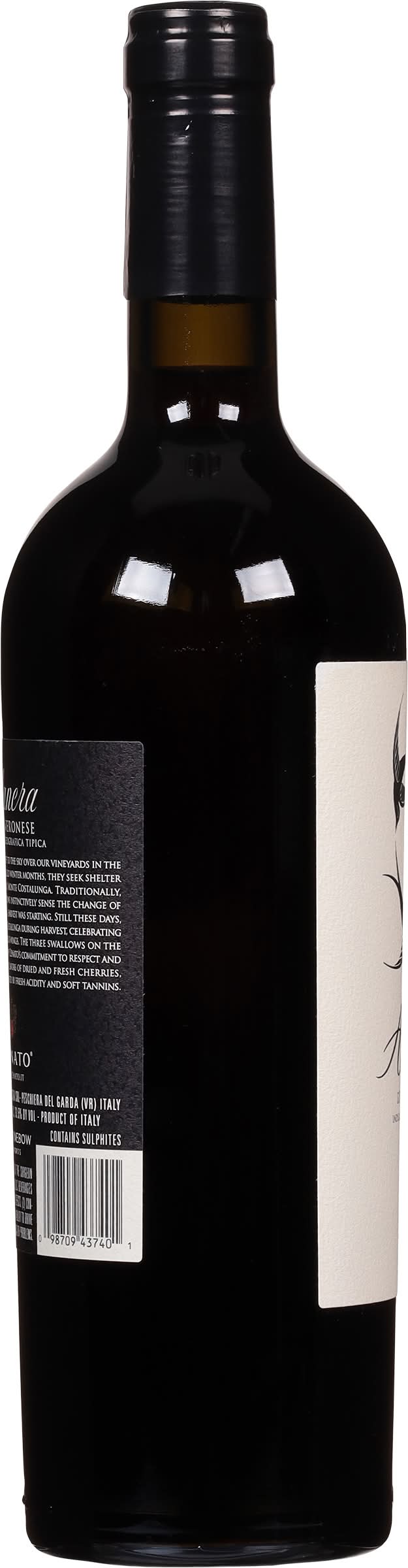 Every spring, swallows give new life to the sky over our vineyards in the heart of Valpolicella, after the cold winter months, they seek shelter among the rocky niches of 'Our' Monte Costalunga traditionally, harvest always starts when swallows instinctively sense the change of the season: swallows were leaving, harvest was starting, Still these does. Shallows fly in the sky of Monte Costalunga during harvest, celebrating the vineyards that lay below their wings. The three swallows on the label of Alanera black wing testify Zenato's commitment to respect and authenticity, Alanera features flavors of dried and fresh cherries, coffee and sweet tobacco, supported by fresh acidity and soft tanning. Alc. 13.5% by vol. • Features : oak aged • Alcohol by volume: 13.5% • Winebow, Inc., Newyork, Ny • Packaging: Reusable