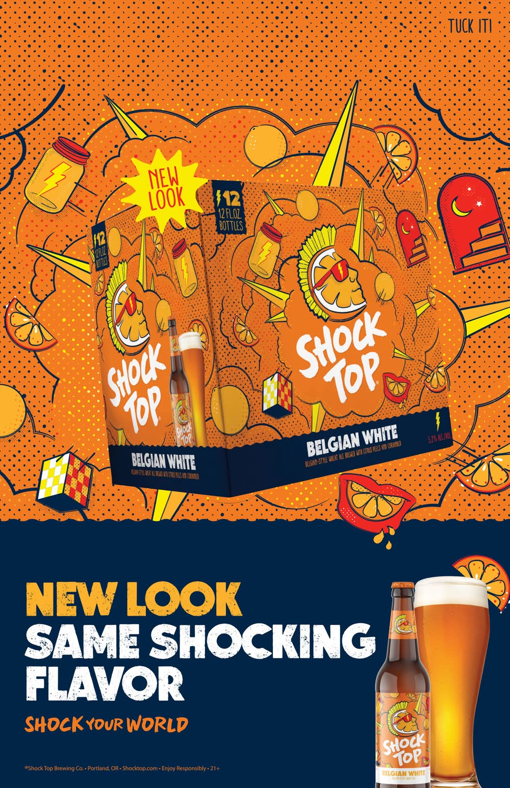 This Belgian-style wheat ale is an invigorating escape from the ordinary. Brewed with real citrus peels for a smooth, citrusy finish. Step into a world of flavor with this shockingly refreshing beer to break you out of the everyday and go on an adventure that makes you want to come back for more. And now Shock Top Belgian White comes has a shockingly new look to match the beer. Bolder, Modern, and Shocking. We’ve kept the core of the Shock Top brand but updated the look and turned up the personality a notch (or three). Every Shock Top beer package is a way out world (or galaxy) of its own. So, when life offers you the mundane, the safe, the usual, shock the routine • Pack size: 12 • Alcohol by volume: 5.2% • Shock top brewing, St. Louis, MO • Packaging: Reusable