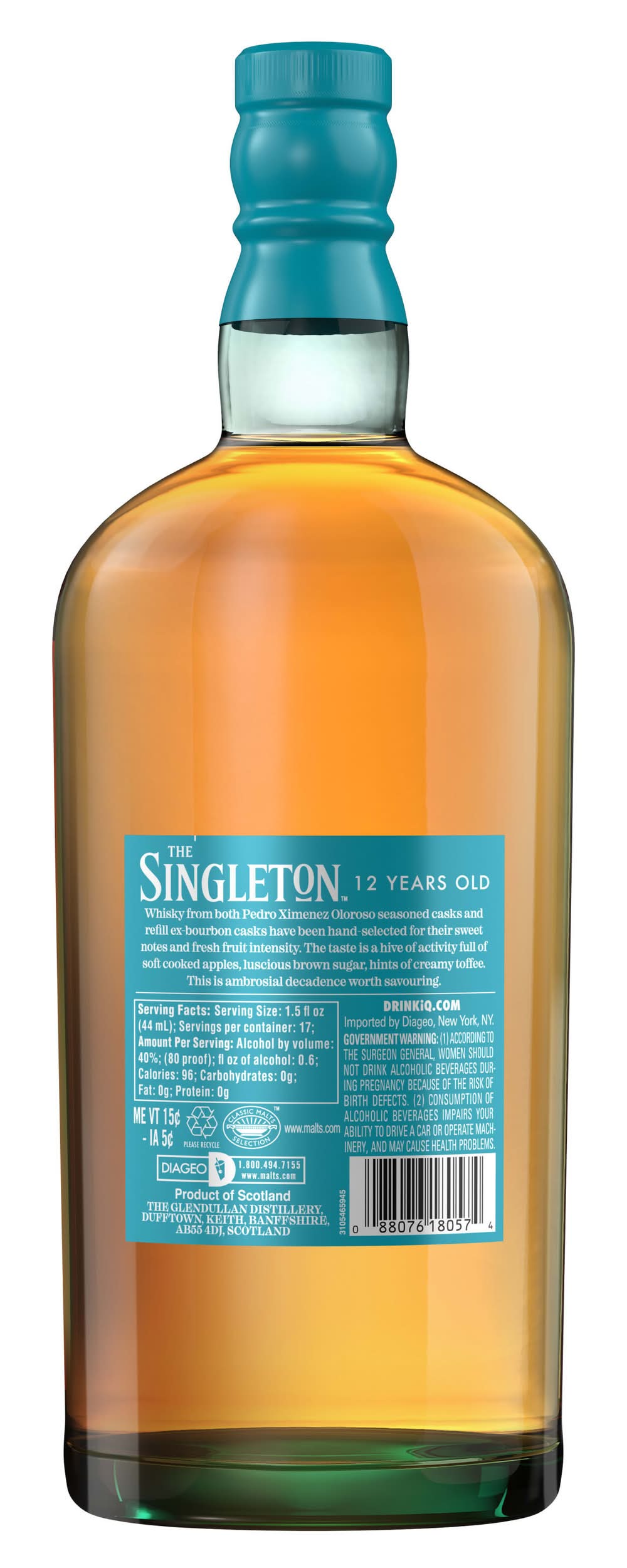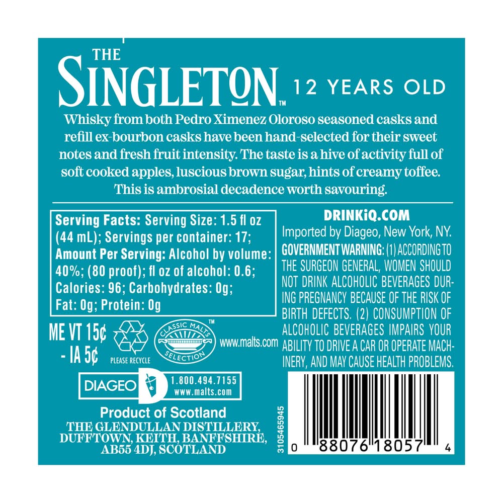 The Singleton 12 Year Old Single Malt Scotch Whisky is just the right balance of rich complexity and flavor. With a fresh, light and clean nose, our whisky ranges from fruity to creamy with a touch of sweet honey. Matured for 12 years in American and European oak casks for a balanced liquid, our combination of citrus and vanilla rounds off the initially spicy edges, making this single malt pleasantly soft to the taste. Delicious however you choose to drink it, our multi-award-winning 80 proof whisky is best enjoyed in the company of friends and in mixed drinks. Singleton Scotch should be enjoyed in a rocks glass, neat or with a drop water. Includes one 80 proof 750 mL bottle of 12 Year Old Single Malt Scotch Whisky. Please drink responsibly. Alcohol by volume: 40%