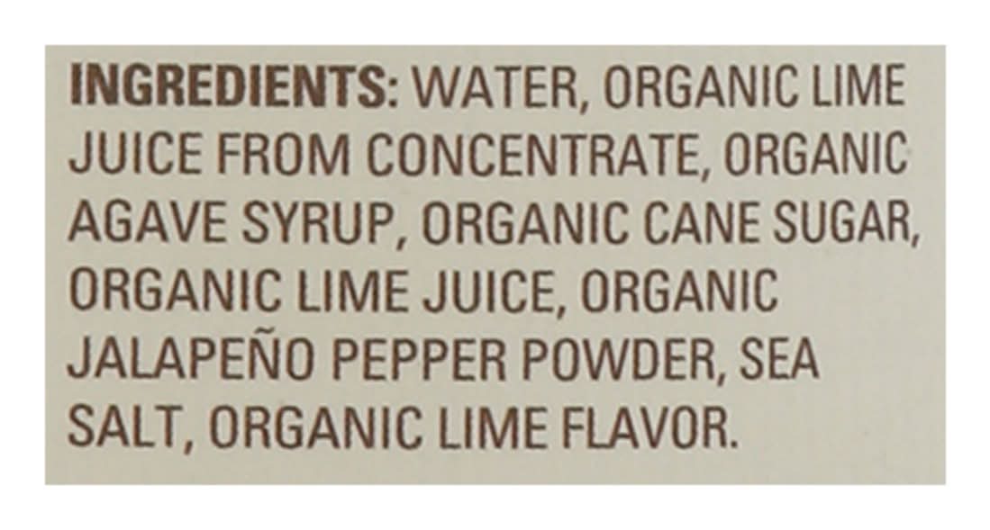 Ingredients: Water, Organic Lime Juice from Concentrate, Organic Agave Syrup, Organic Cane Sugar, Organic Lime Juice, Organic Jalapeno Pepper Powder, Sea Salt, Organic Lime Flavor