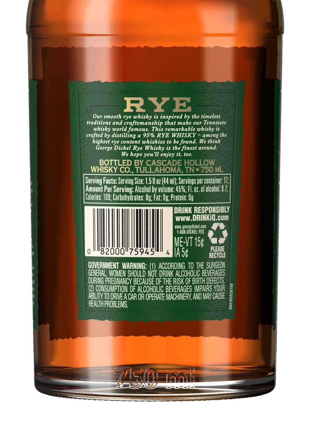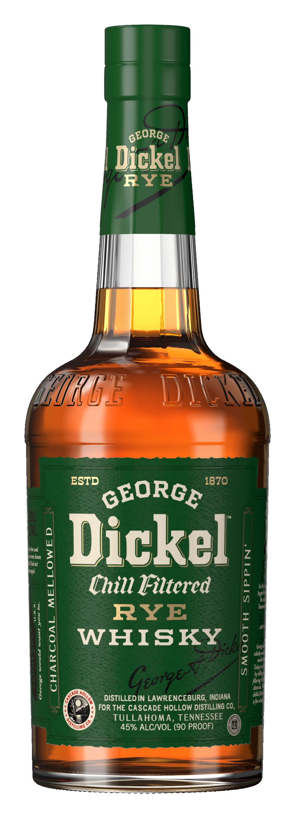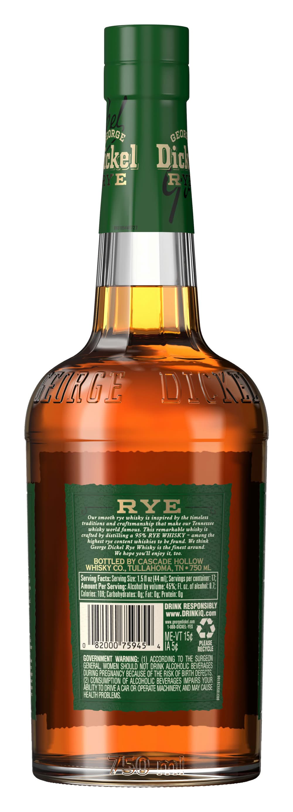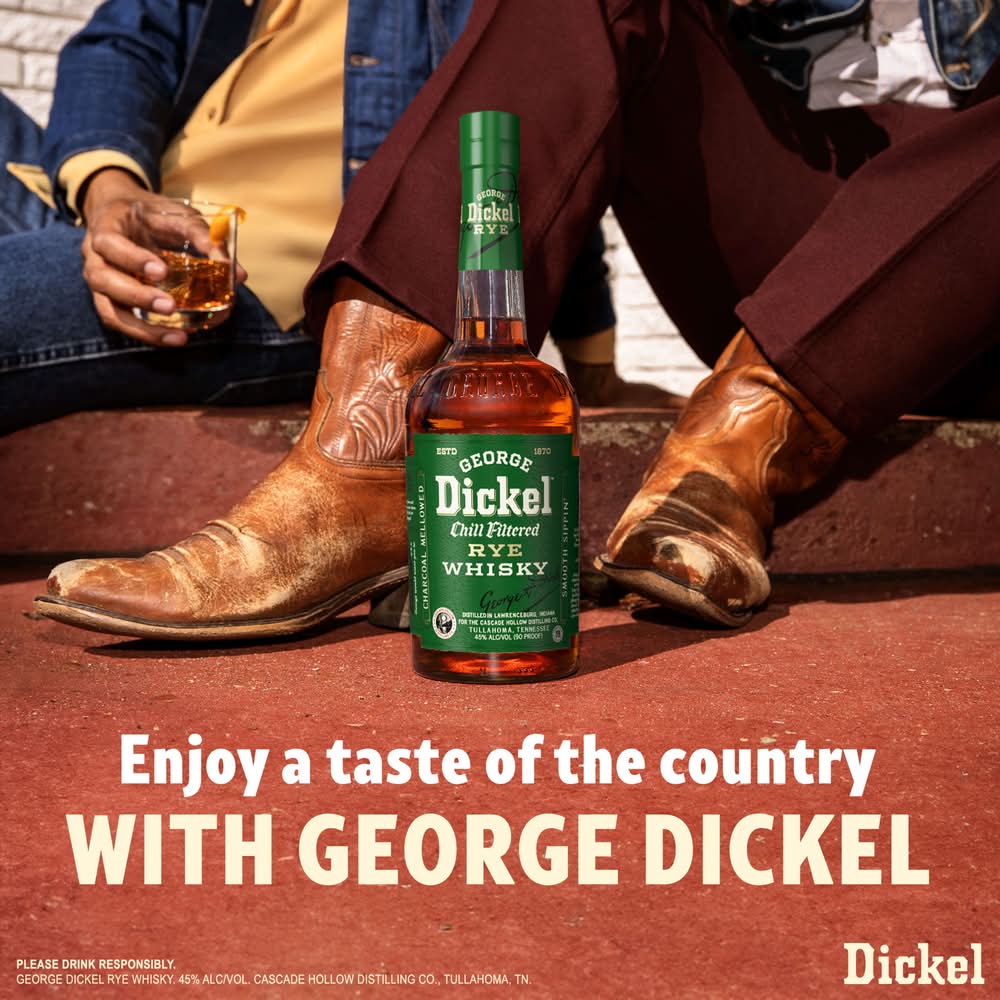 George Dickel Rye Whisky brings depth, range and personality with spicy flavor and subtle fruit notes ending in a remarkably smooth finish. Our 90 proof Rye whisky is made from 95% rye and 5% malted barley. It's chilled before undergoing charcoal-mellow filtration creating a truly unique blend. With its complex flavor and finish, our rye whisky is perfect for sipping on its own or adding a delicious kick to your favorite cocktail. Best enjoyed in a Dickel Highball. Includes one 90 proof 750 mL bottle of George Dickel Rye Whisky. Please drink responsibly. Alcohol by volume: 45%