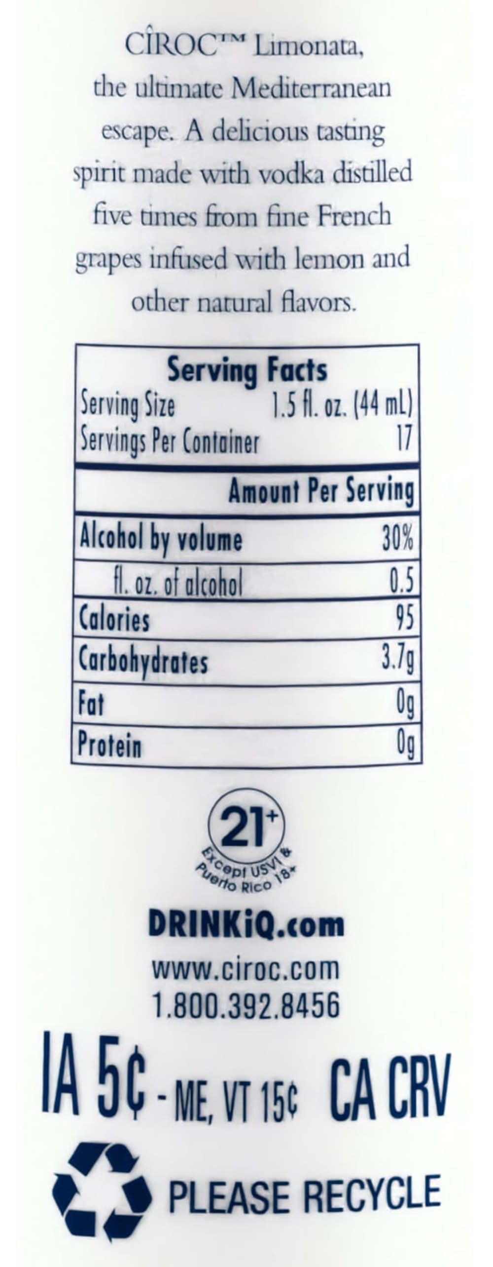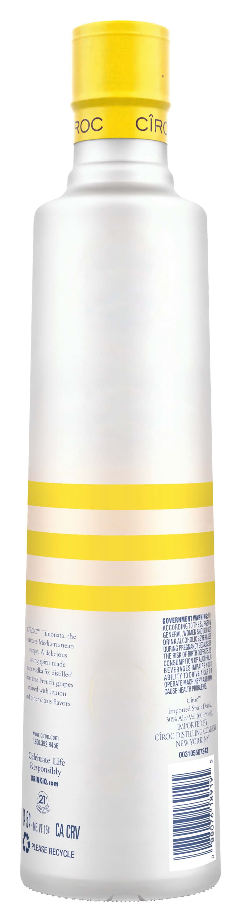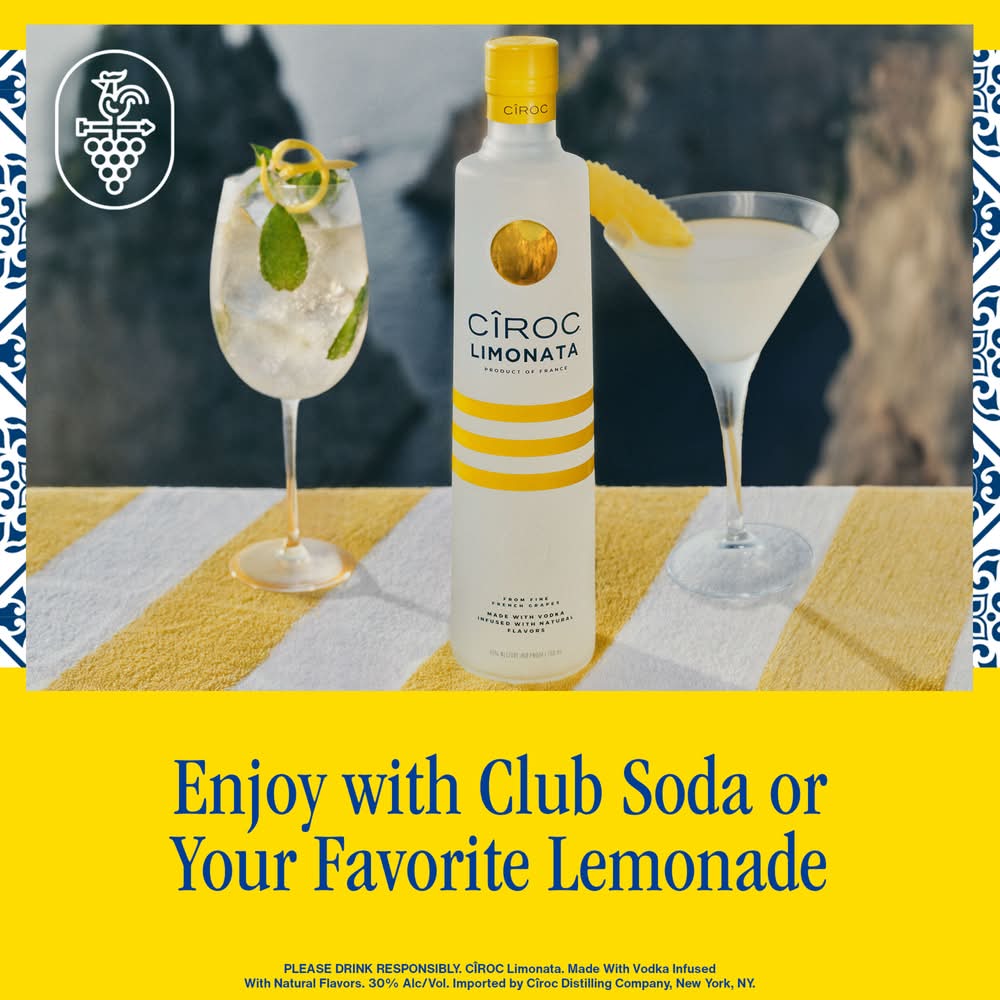Transport the flavors and experience of a Mediterranean summer with . Serve elevated indulgence with quality crafted vodka infused with citrus and Italian lemon flavors. CIROC Limonata shines through its refined flavors inspired by luxurious destinations such as Southern Italy and Capri. On the nose are notes of zesty, fresh lemons. Upon your first sip, CIROC Limonata embarks you on a journey across your taste buds with tasting notes of bold, sun-ripened lemon and fresh, zesty limes with a tart finish balanced with a lingering sweetness. It’s best served in a Limonata spritz cocktail. Includes one 60 proof 750 mL bottle of CIROC Limonata (Made with Vodka Infused with Natural Flavors). Please drink responsibly. • Flavor: Limonata • Alcohol by volume: 30%
