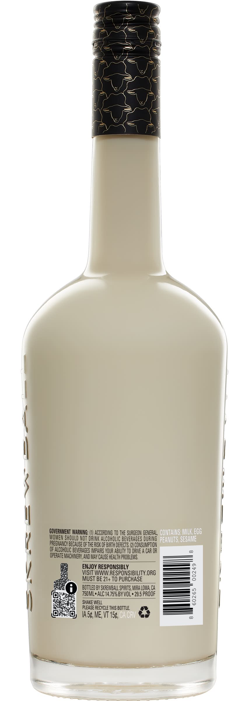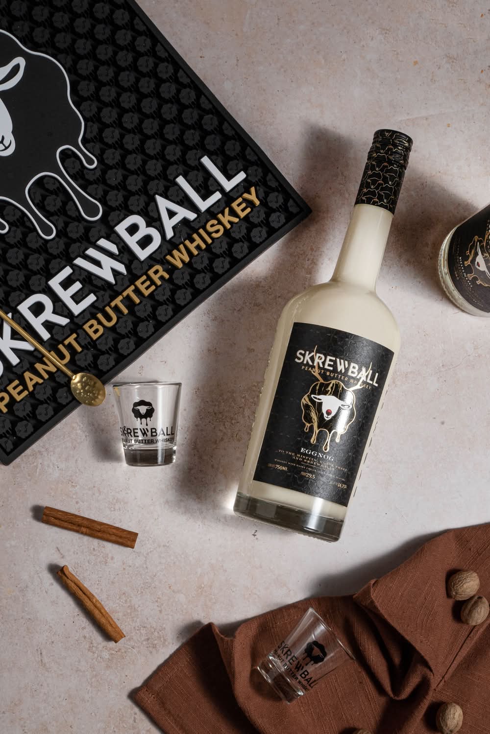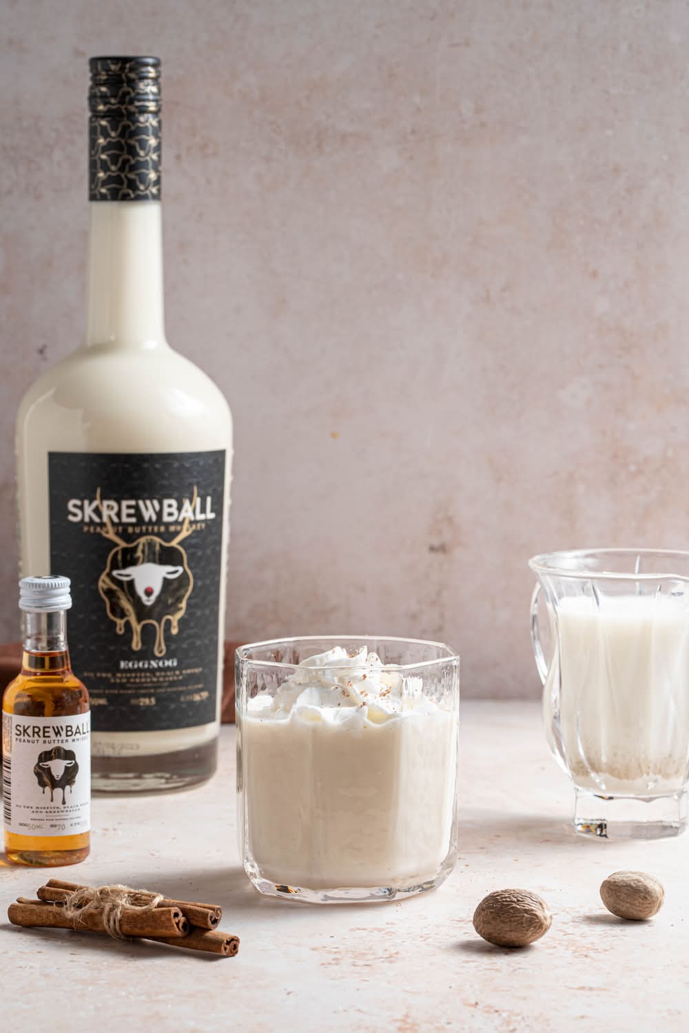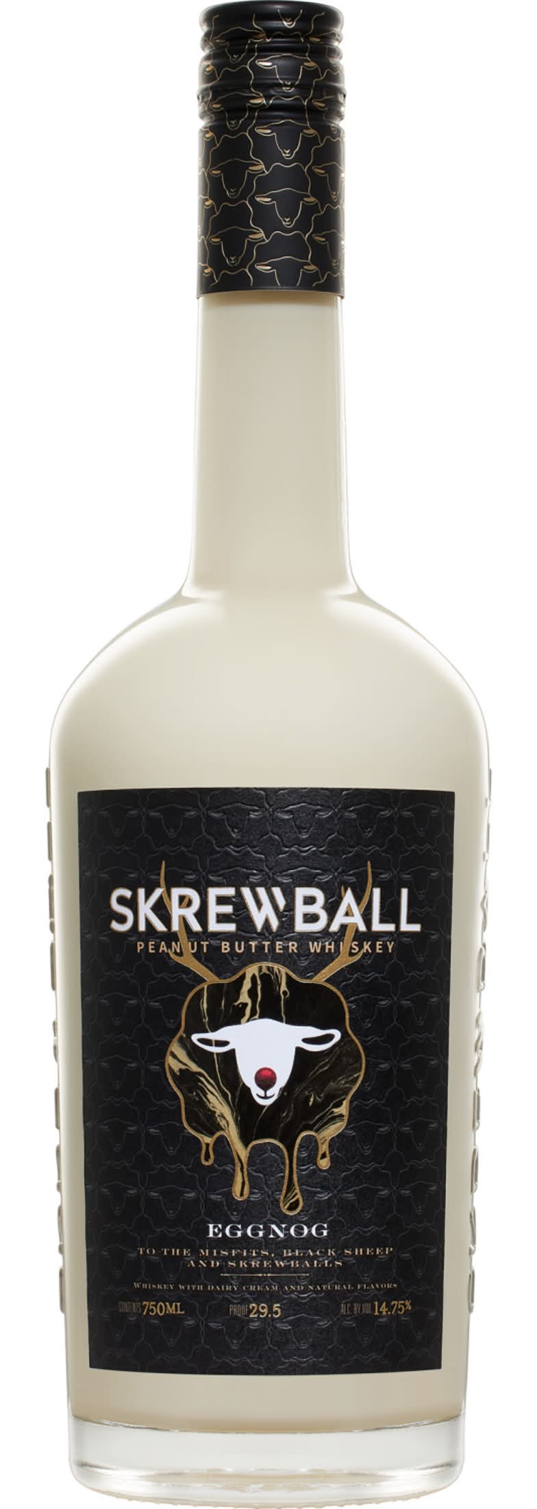 A creamy, delicious combination of Skrewball Peanut Butter Whiskey and eggnog made with dairy cream, spicy eggnog flavor and notes of cinnamon and vanilla. Alcohol by volume: 14%