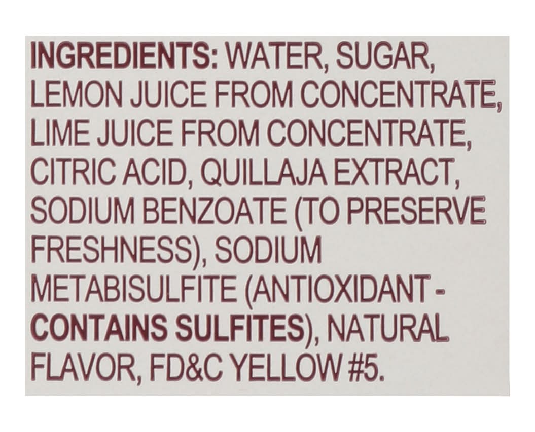 Ingredients: Water, Sugar, Lemon Juice from Concentrate, Lime Juice from Concentrate, Citric Acid, Quillaja Extract, Sodium Benzoate (to Preserve Freshness), Sodium Metabisulfite (Antioxidant - Contains Sulfites), Natural Flavor, FD&C Yellow 5 Contains: Sulfites