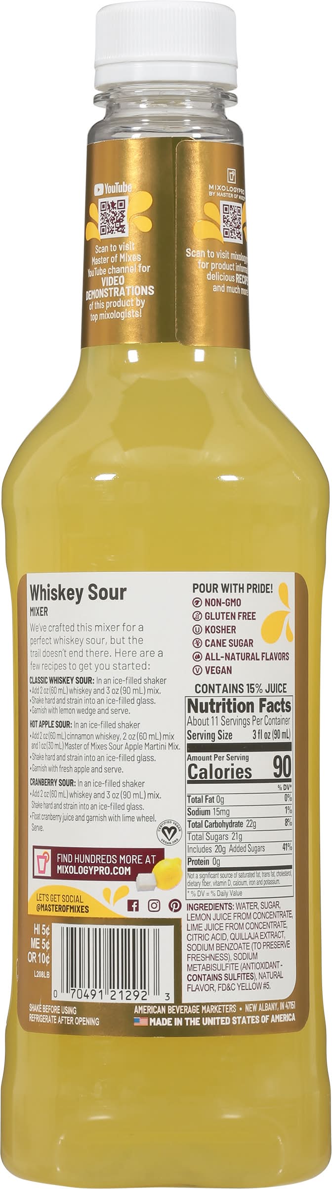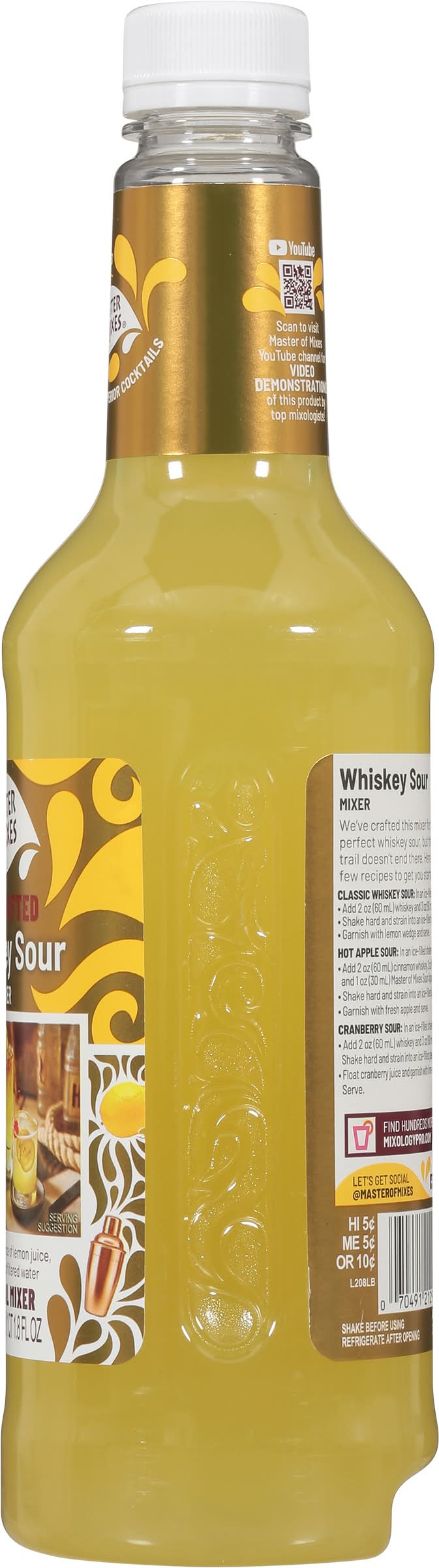 Shake before using. refrigerate after opening. classic whiskey sour: in an ice-filled shaker. add 2 oz (60 ml) whiskey and 3 oz (90 ml) mix. shake hard and strain into an ice-filled glass. garnish with lemon wedge and serve. cranberry sour: in an ice-filled shaker. add 2 oz (60 ml) whiskey and 3 oz (90 ml) mix. shake hard and strain into an ice-filled glass. float cranberry juice and garnish with lime wheel. serve. hot apple sour: in an ice-filled shaker. add 2 oz (60 ml) cinnamon whiskey, 2 oz (60 ml) mix and 1 oz (30 ml) master of mixes sour apple martini mix. shake hard and strain into an ice-filled glass. garnish with fresh apple and serve.