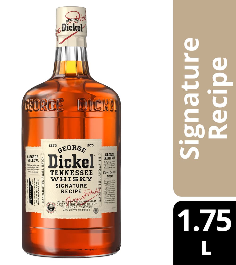 George Dickel Signature Recipe Tennessee Whisky brings depth, range and personality with a deep, assertive flavor and remarkably smooth finish. Our 90 proof whisky contains blends of old, brazen whiskies creating a warm flavor of rich, smoky oak and subtle vanilla. It's chilled before undergoing charcoal mellow filtration creating a truly unique blend. With its complex flavor and finish, our Signature Recipe Tennessee whisky is perfect for sipping on its own or adding a delicious kick to your favorite cocktail. Best enjoyed in a Dickel Highball. • Alcohol by volume: 45% • Packaging: Reusable