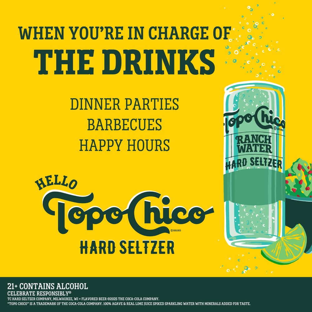 Introducing Topo Chico Ranch Water Hard Seltzer, a new spiked sparkling water made with 100% agave for sweetness and real lime juice. It's a refreshing twist on lime seltzer with a light, refreshing flavor and real lime juice, plus added minerals for taste. Crafted to taste like the Texas cocktail. • Flavor: Signature lime • Pack size: 12 • Alcohol by volume: 4.7% • Packaging: Reusable
