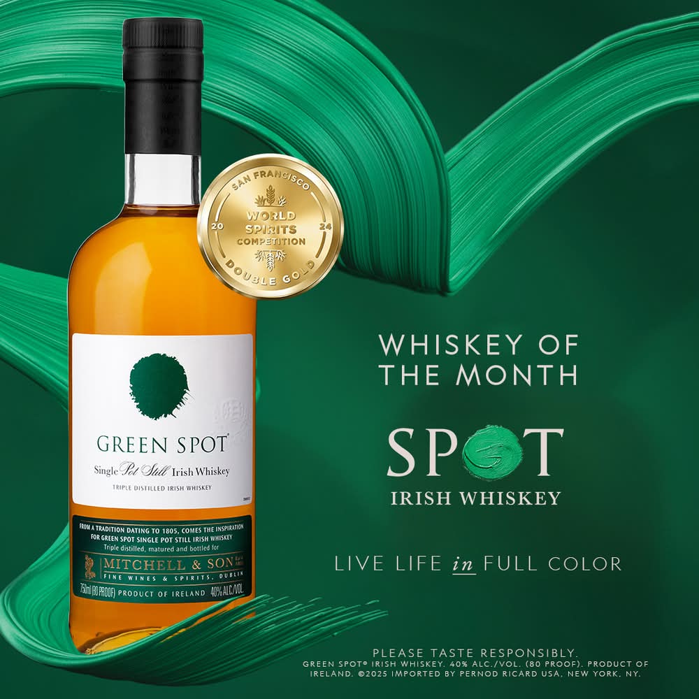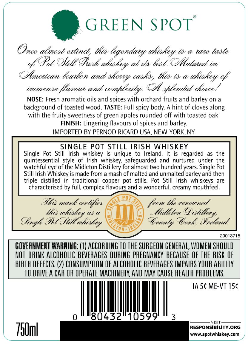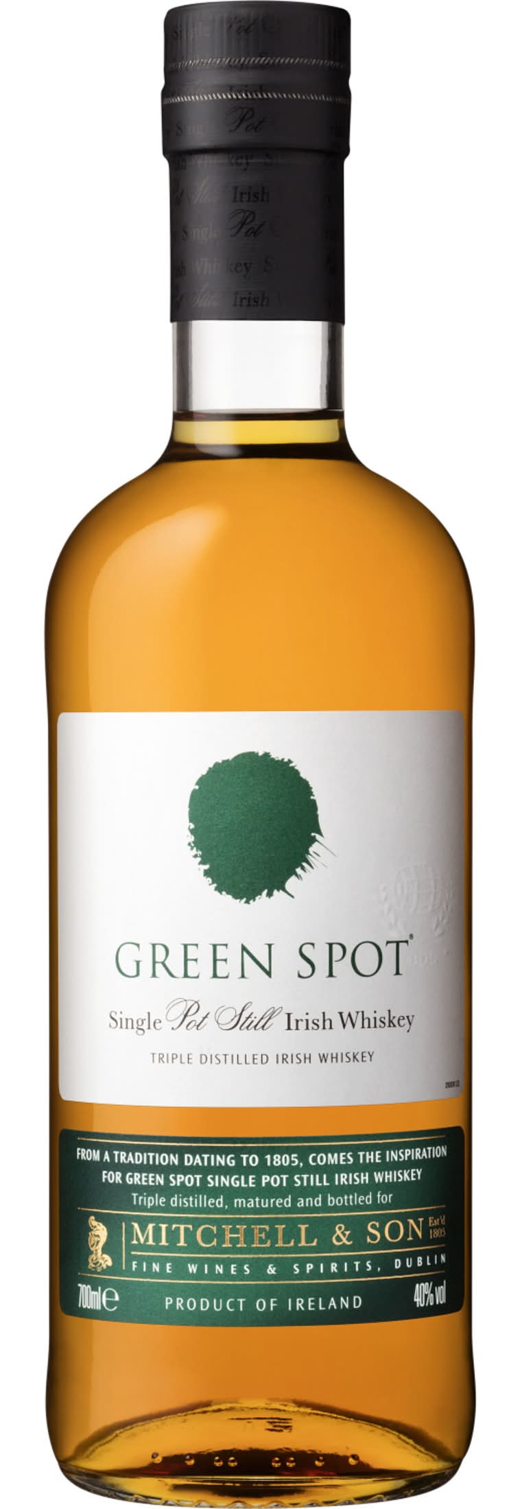 Green Spot is a non-age statement Single Pot Still Irish whiskey and is comprised of Pot Still whiskeys aged between 7 and 10 years. The whiskey has matured in both ex-bourbon and ex-sherry casks with only a small quantity bottled each year. Alcohol by volume: 40%