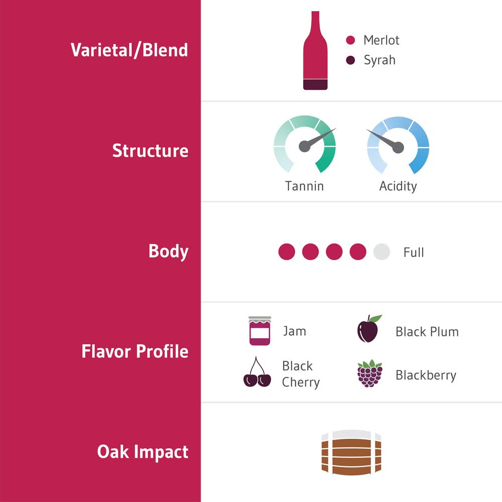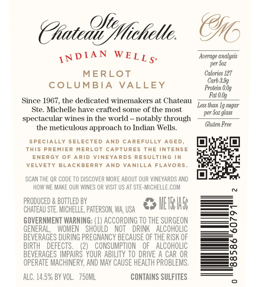Chateau Ste. Michelle Indian Wells Merlot is a premier red wine, carefully aged to capture the intense energy of arid vineyards resulting in velvety blackberry and vanilla flavors. The full bodied, rich mouthfeel is balanced by a firm structure and noticeable yet refined oak tannins, lead into a lush, savory, and satin-like finish. A polished wine crafted in an approachable style makes this Merlot wine an ideal pairing for a variety of appetizers and entrees. Impress your guests and try pairing with grilled tri-tip, backyard BBQ ribs and burgers, or charcuterie and gourmet cheeses. The Chateau Ste. Michelle Indian Wells Merlot bottle of wine is 750 mL and is 14.5% ABV. Since 1967, the dedicated winemakers at Chateau Ste. Michelle have crafted some of the most spectacular wines in the world—notably through the meticulous approach to Indian Wells. At Chateau Ste. Michelle, the experience of Washington State’s inviting elegance and sophistication is in everything we do. Championing craftsmanship and creativity to provide a sense of wonder in every bottle. Chateau Ste. Michelle winery owns 3,500 acres in the Columbia Valley of eastern Washington, including Horse Heaven, Canoe Ridge Estate and Cold Creek vineyards. • Alcohol by volume: 14.5% • Chateau Ste. Michelle, Peterson,WA • Packaging: Reusable