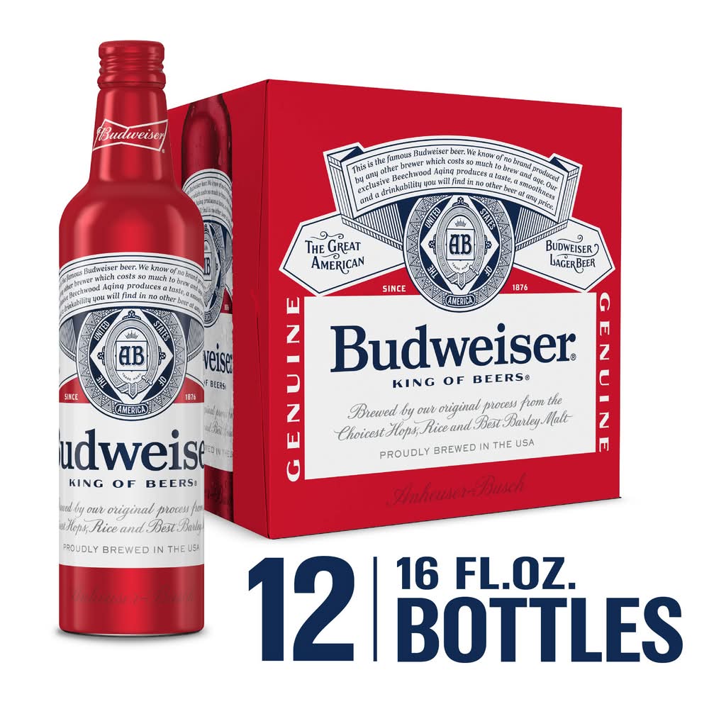 This is the famous budweiser beer. we know of no brand produced by any other brewer which costs so much to brew and age. our exclusive beechwood aging produces a taste, a smoothness and a drinkability you will find in no other beer at any price. the great american budweiser lager beer. since 1876. genuine. king of beers. brewed by our original process from the choicest hops, rice and best barley malt. pairs well with fried chicken, fajitas and brisket enjoy responsibly please recycle