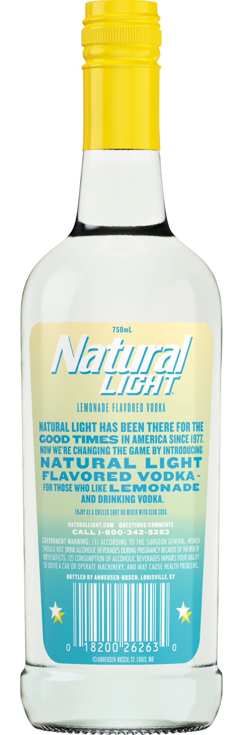 4x distilled. Go proof. Natural Light has been there for the good times in America since 1977. Now we're changing the game by introducing Natural Light flavored vodka - for those who like lemonade and drinking vodka. • Flavor: Lemonade • Alcohol by volume: 30%