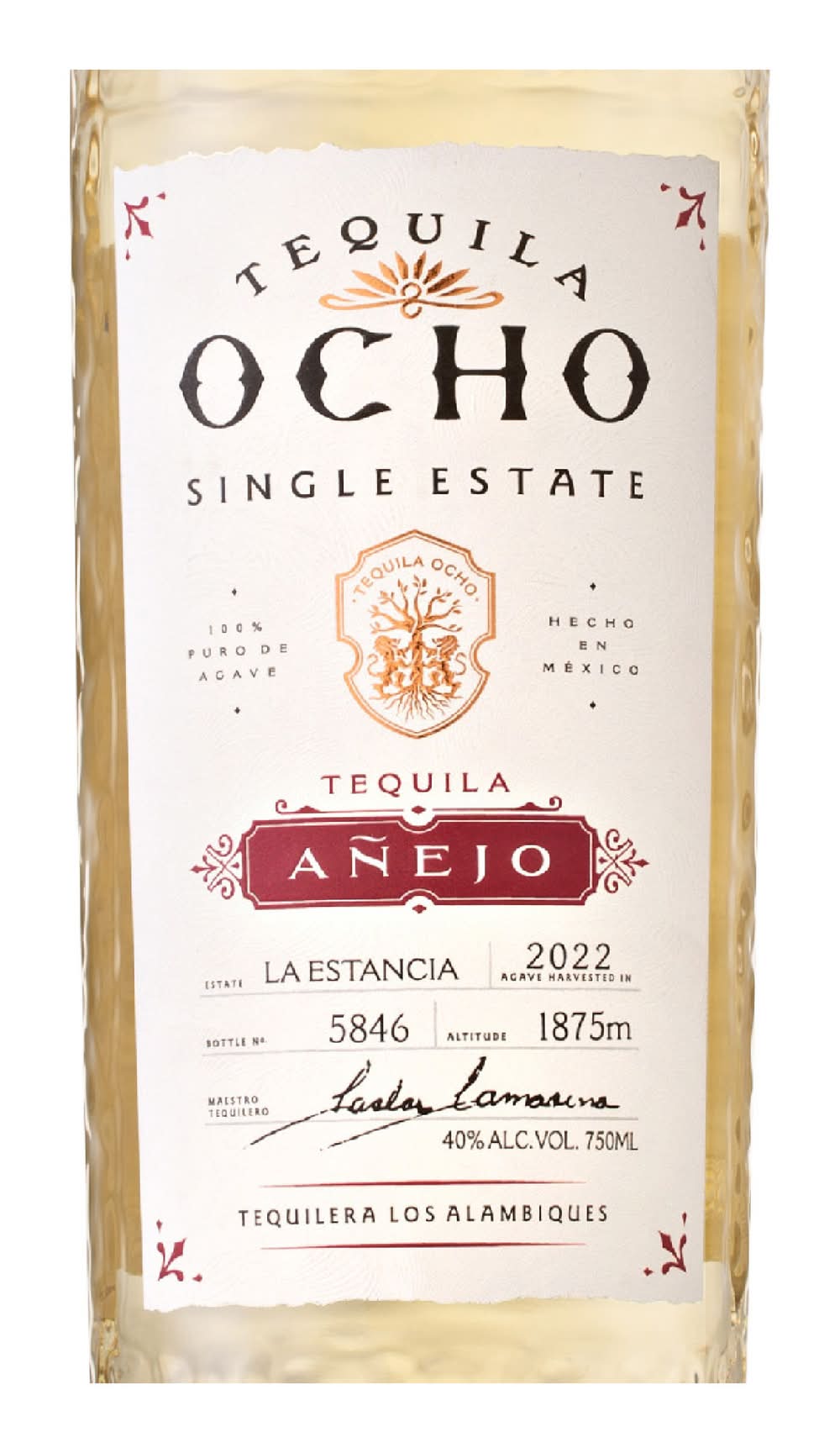 Tequila Ocho Añejo is aged for one year in seasoned ex American whiskey barrels, imparting complexity without overshadowing the agave's essence. These bold agave flavors are proof that terroir exists in tequila, leading to an unparalleled sipping experience. Produced artisanally, this expression uses only overripe agaves that are slow cooked in brick ovens, naturally fermented, double-distilled at low temperatures, and aged for one year. Ocho Añejo offers complex agave flavors with notes of dark cacao, coffee, and dried fruits with a buttery finish. Alcohol by volume: 40%