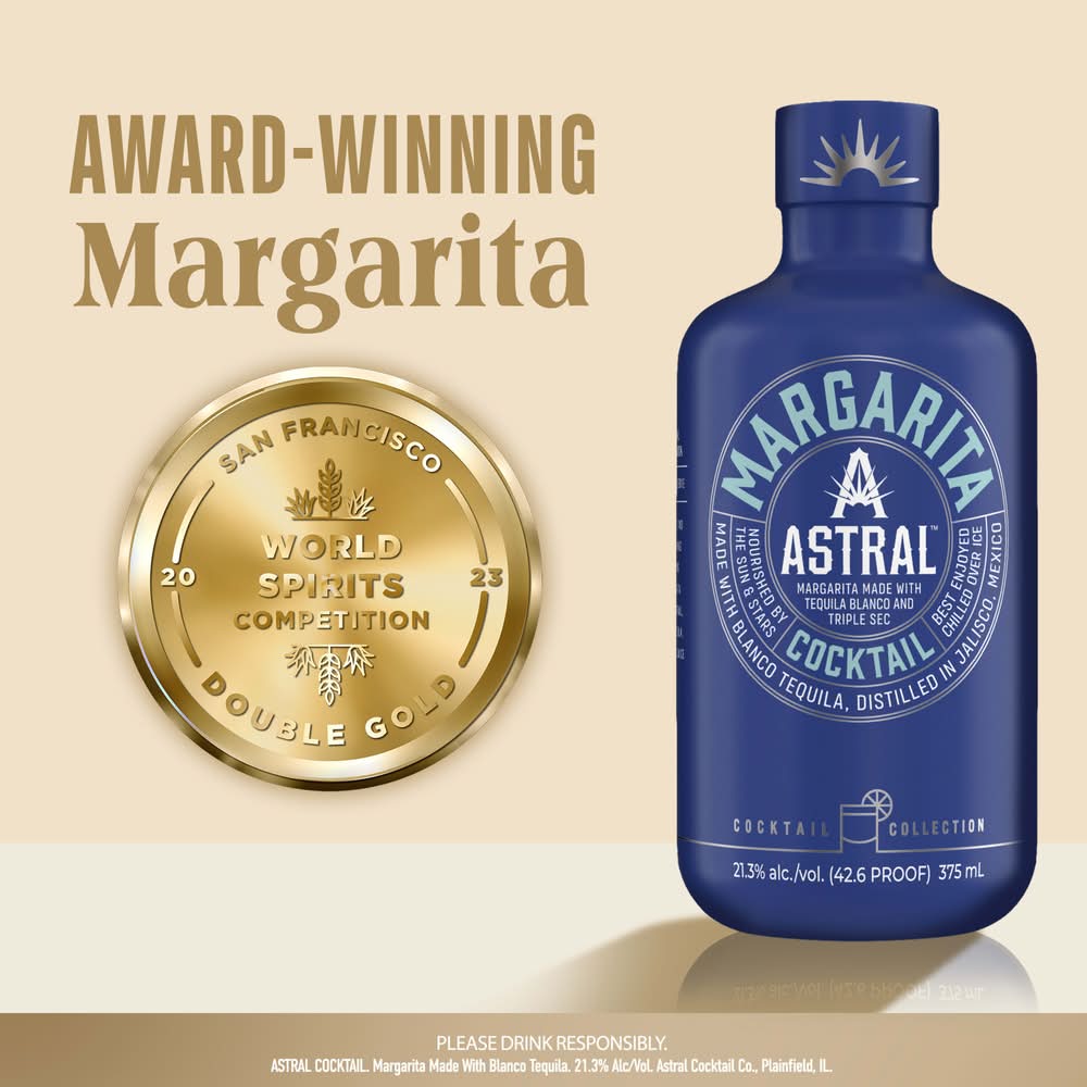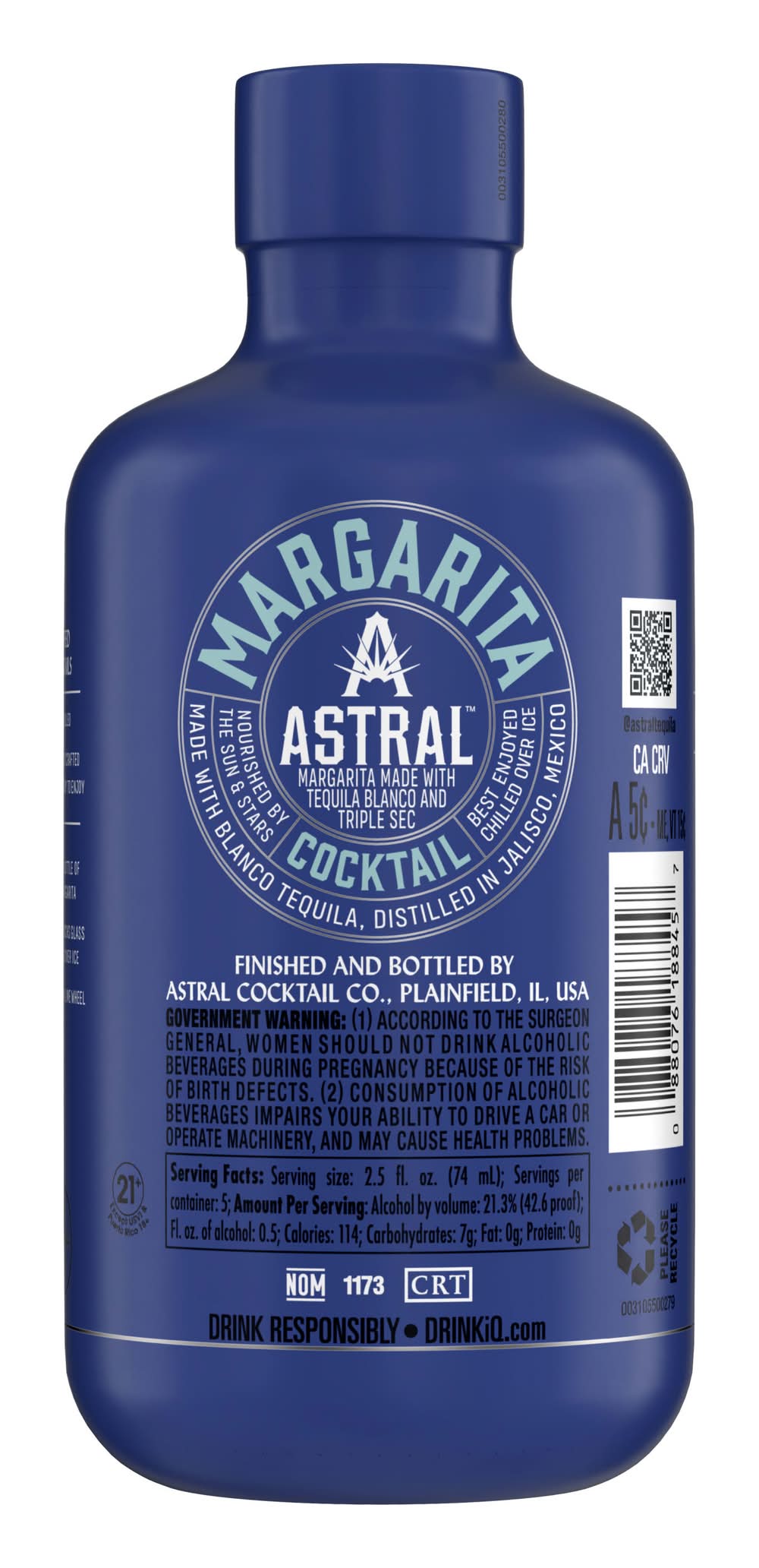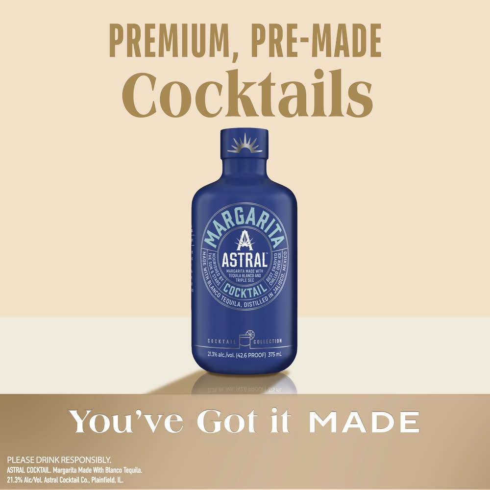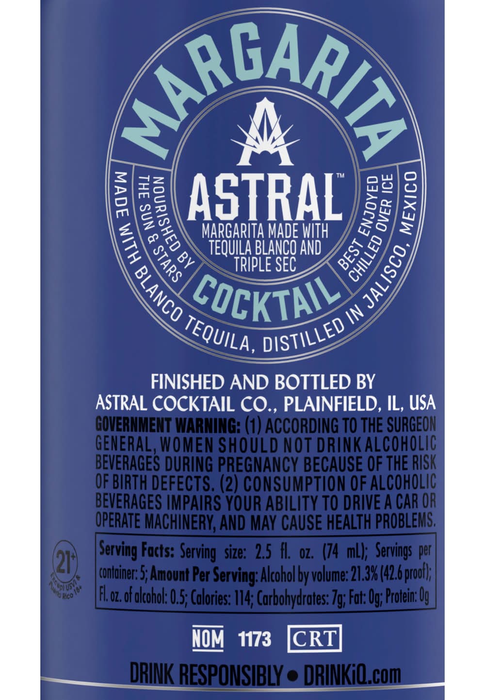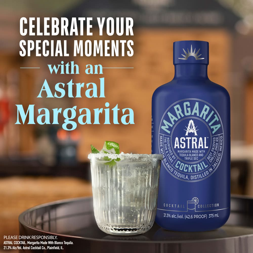 Toast to convenience with the ready-to-serve Astral Margarita Cocktail, part of the Cocktail Collection. On the nose are notes of tequila cut with notes of lime juice and triple sec, with tasting notes of agave, lime, tangerine, and vanilla ending with a tart, rounded finish. Just pop open the cork and serve for a refreshing-tasting, delicious margarita. Includes one 21.3% alc./vol. 375 mL bottle of Astral Margarita Cocktail. Please drink responsibly. Alcohol by volume: 21.3%