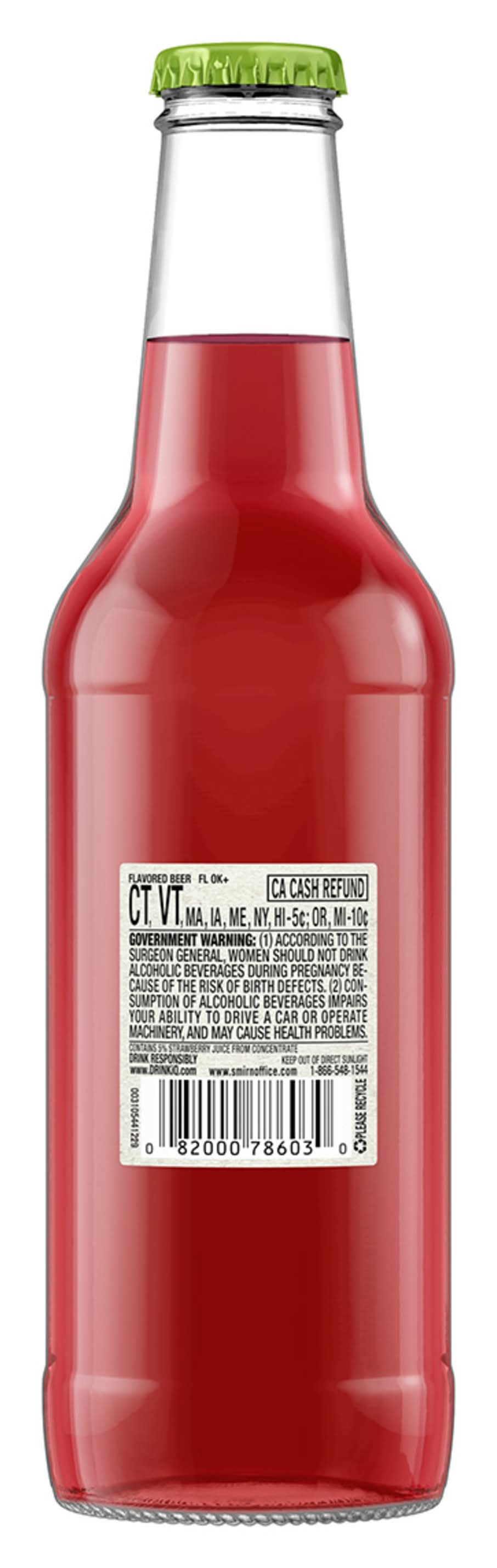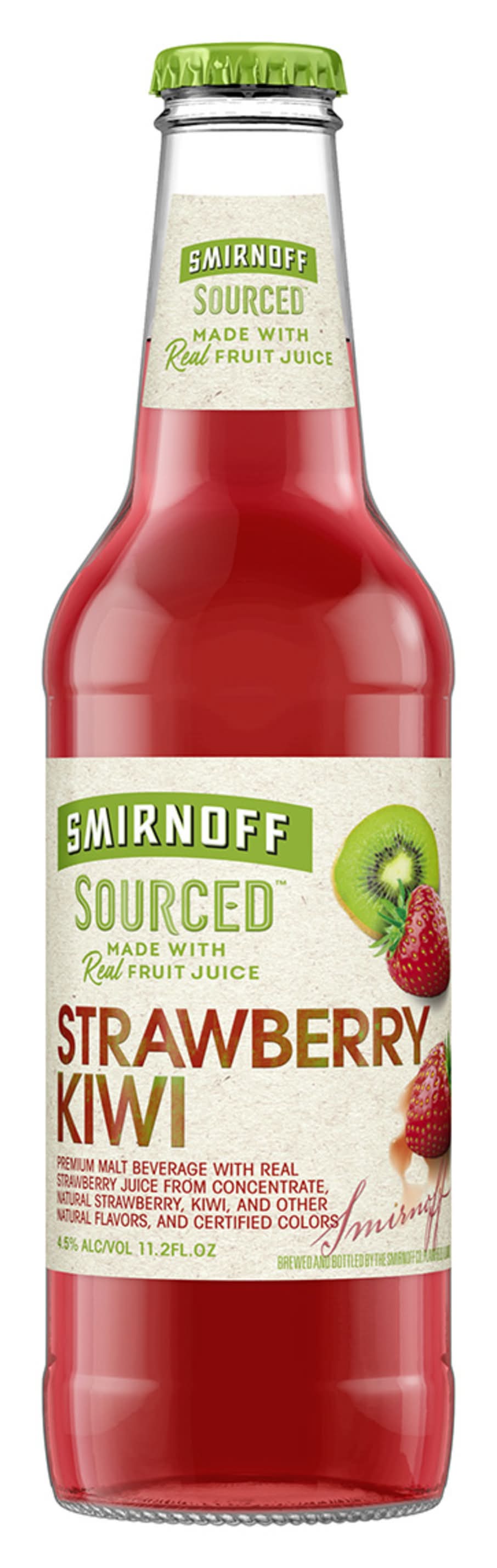 Offers a blend of juicy strawberry and kiwi flavors, crafted with real fruit juice. • Flavor: Strawberry kiwi • Pack size: 6 • Alcohol by volume: 4.5% • The Smirnoff Co., Plainfield,IL