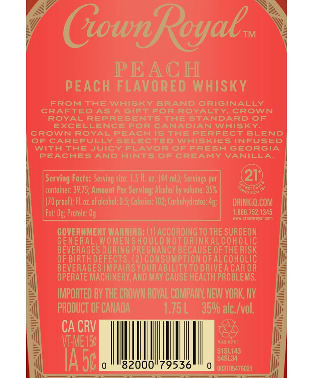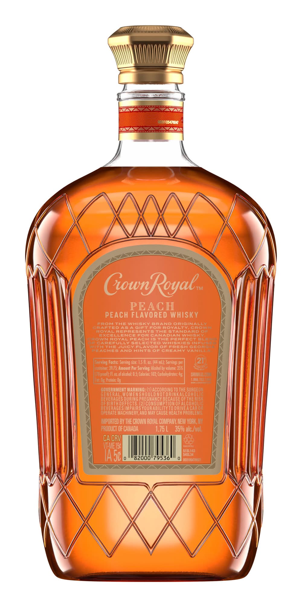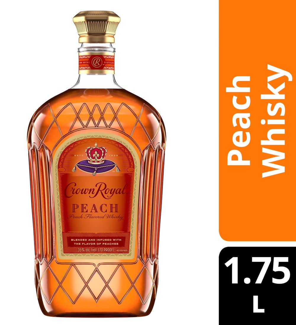 Unwind in luxury with a glass of Crown Royal Peach Flavored Whisky. To create this extraordinary blend, fresh Georgia peaches are harvested, de-stoned, pressed and strained to preserve their bright, aromatic taste. Then, our master blender infuses the juicy flavor for a vibrant and delicious whisky with luscious notes of creamy vanilla and a decadently sweet finish. Made with the signature smoothness of traditional Crown Royal, our peach flavored whisky will enhance a cozy cocktail party or rooftop celebration. Perfect for a Royal Peach Fizz cocktail. Includes one 70 proof 1.75 L bottle of Crown Royal Peach Flavored Whisky. Please drink responsibly. • Flavor: Peach • Alcohol by volume: 35%