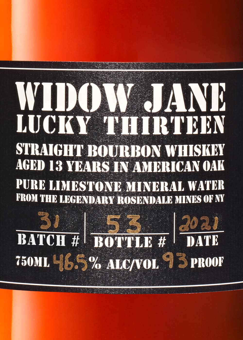 SMALL BATCH Whiskey from Red Hook, Brooklyn, NY. Widow Jane scours the country for the finest barrels of Straight Bourbon & Rye Whiskeys. Hand assembled right here in the Red Hook neighborhood of Brooklyn, New York, we bring these to you with non chill-filtration, and proofed with a hard-yet-sweet pure limestone water from the Legendary Rosendale Mines of Upstate New York. Aged for a minimum of thirteen years, non-chill filtered & proofed with our own limestone mineral water from the Legendary Rosendale Mines of NY, Lucky Thirteen is always a way to share good fortune. Alcohol by volume: 46.5%