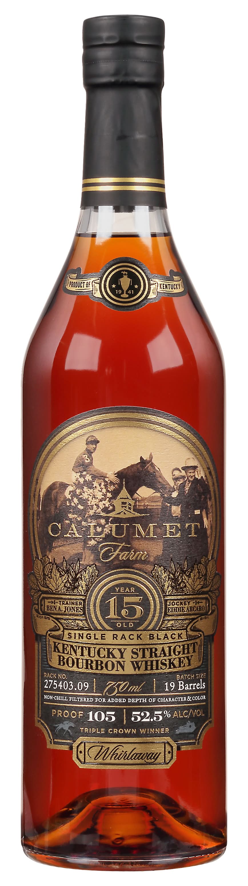 Single rack black. Trainer Ban A. Jones. 15 year old. Jockey Eddie Arcaro. Rack no: 275401.09. Batch size 19 Barrels. Non-Chill filtered for added depth of character & color. Triple crown winner. Whirlaway. In 1941, Whirlaway was ready to shock the world with his amazing speed. Whirlaway had a tendency to bolt toward the outside rail. Trainer Ben Jones spent many sessions trying to break the habit with no luck. The more he tried to tame the wild Whirlaway, the more ornery and bold he became. As a last resort, the day before the Kentucky Derby, Ben Jones cuts one of Whirlaway's Blinkers away. It works. Whirlaway, ridden by Eddie Arcaro, not only gives Calumet Farm its first Kentucky Derby victory but he does it with an 8-length victory in a record time of 2:01 2/5. Whirlaway subsequently gives Calumet its first Triple Crown after dominating the Prekness and the Belmont races as well. He later added a win at the Travers Staker to complete the Grand Slam of thoroughbred racing. To accomplish this feat. Whirlaway also captures the honored title of 1941 Horse of the Year. To honor the legacy of Calmet Farm and its first Triple Crown winning horse, this exquisite bourbon has been crafted with the same passion and dedication that lead Whirlaway to victory. 52.5% alc/vol. 105 Product of Kentucky. Bottled by Three Springs Bottling Company, Bowling Green, KY for western spirits. Alcohol by volume: 52.5%
